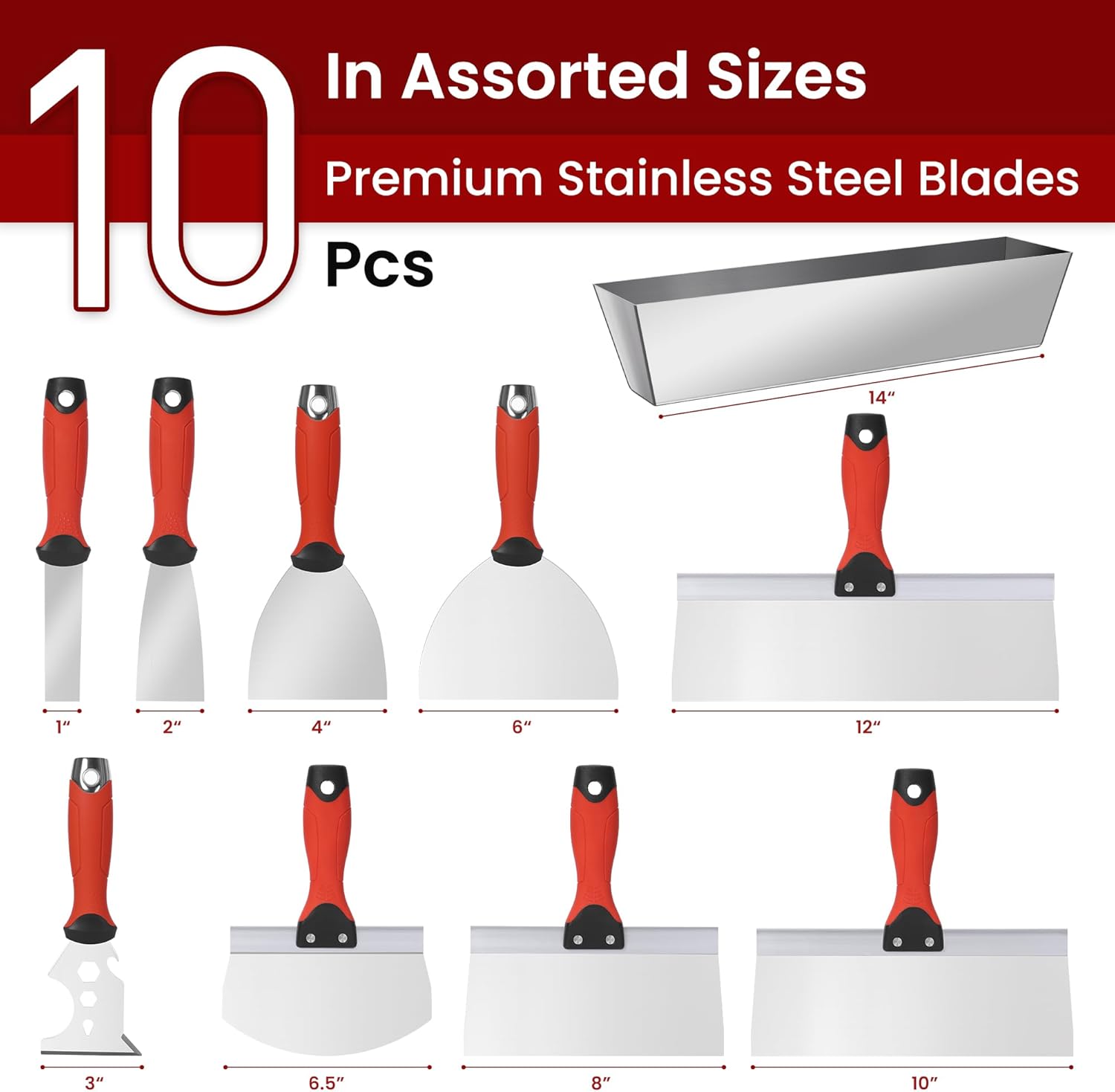 10Pcs Drywall Tool Kit, Stainless Steel Putty Knife Set with 1″-6″ Knives, 8″-12″ Taping Knives, 9-in-1 Painter Scraper, 12″ Mud Pan & 6″ Scoop for Drywall Taping, Finishing, and Patching