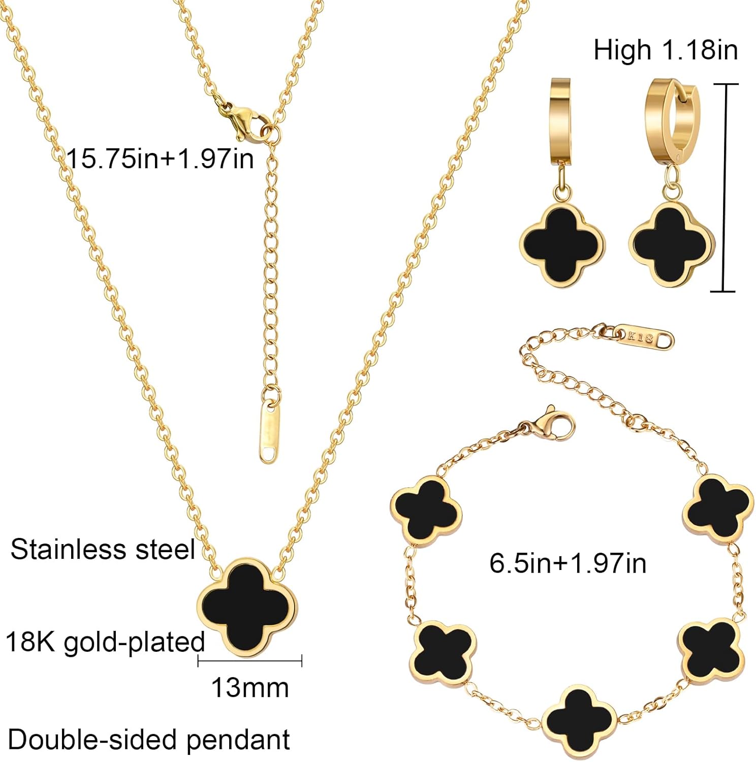 18K Gold Plated Lucky Clover Jewelry Set Black White and Red Four Leaf Clove Bracelet Necklace and Earrings Fashion Birthday Gifts for Women
