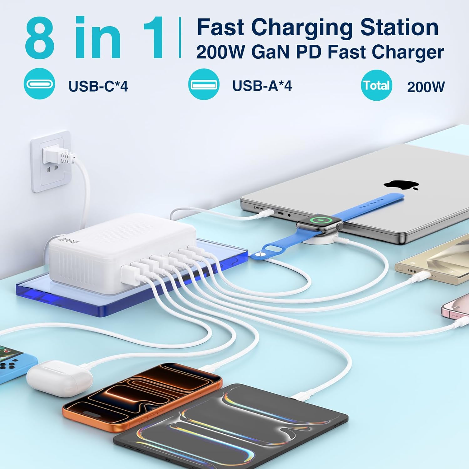 200W GaN III USB C Charging Station, 8-Port (4C+4A) Fast Charger Hub, Universal Wall Charger Block for iPhone 17/16/15/14 Pro Max, iPad, Samsung Galaxy Note, Pixel, Laptops & More