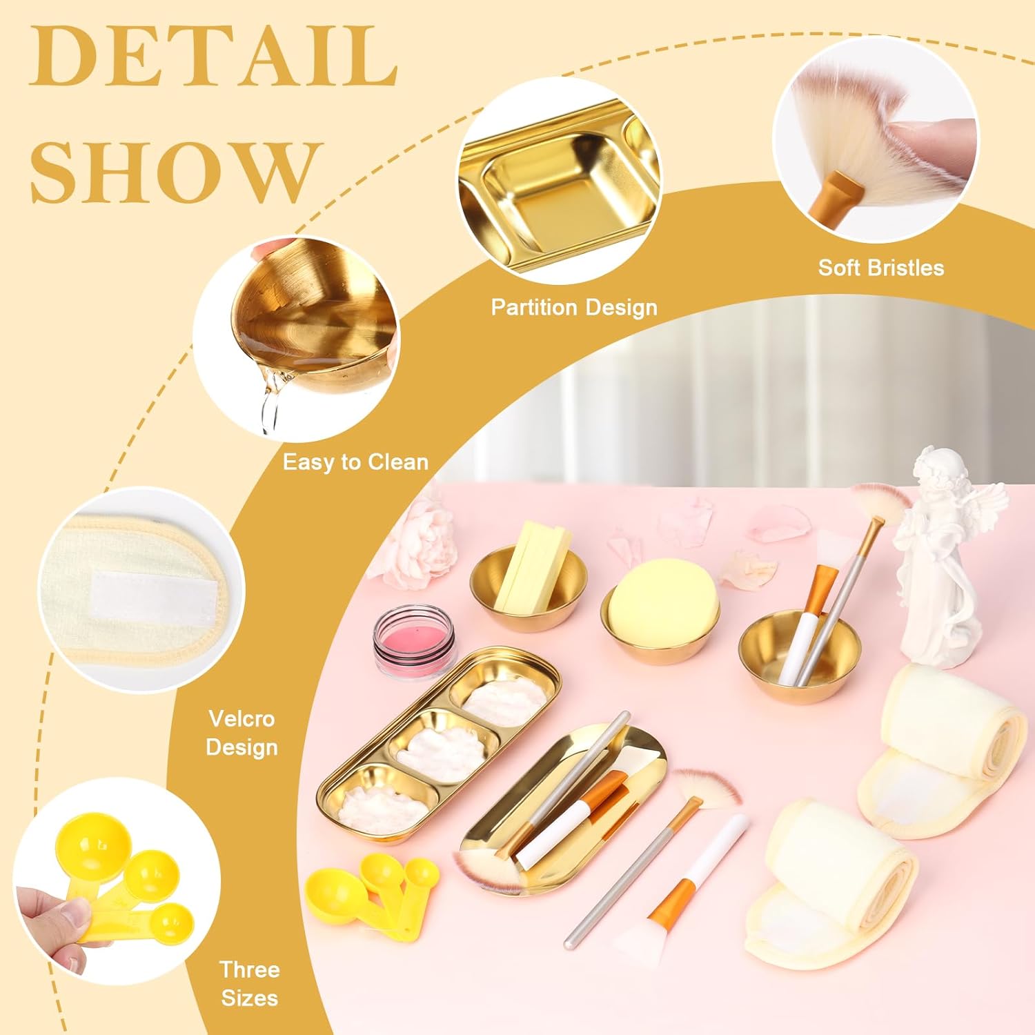 1.Supplies for facials: You will receive a complete set of facial care tools, including 3 pcs 3.2×1.3 inch gold stainless steel facial mask mixing bowls, a sleek 7×3.3 inch skincare tray, and an 8.3×3.15 inch vintage style 3-compartment serving tray. The set also includes three 7.8×2.4-inch fan brushes, three 5.7×1.3 inch mask applicator brushes, two 9.8×3.5 inch cream color hairbands, three measuring spoons in different sizes (3×1.6 inch, 2.8×1.2 inch, and 2.6×1.4 inch), and twelve 3.15-inch premium facial sponges for seamless blending, with soft bristles and sponge for gentle application.