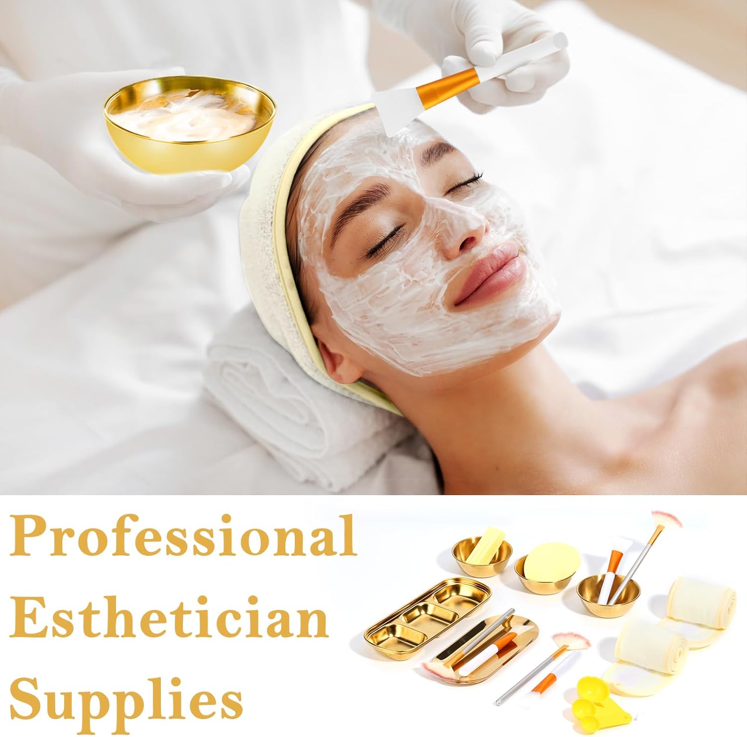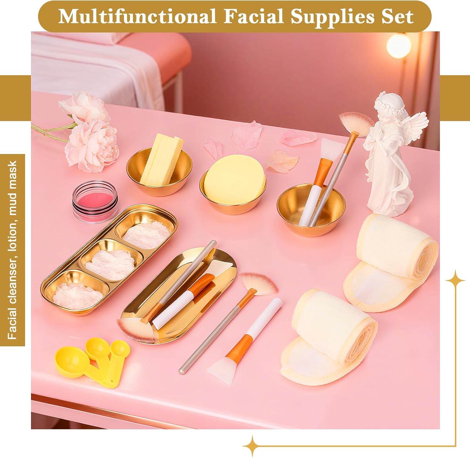 28 Gold Facial Supplies 3 Facial Mask Mixing Bowls 3 Facial Fan Brushes 3 Mask Applicator Brushes 3 Mask Measuring Spoons Skincare Tray 3-Compartment Serving Tray 12 Facial Sponges 2 Spa Headbands