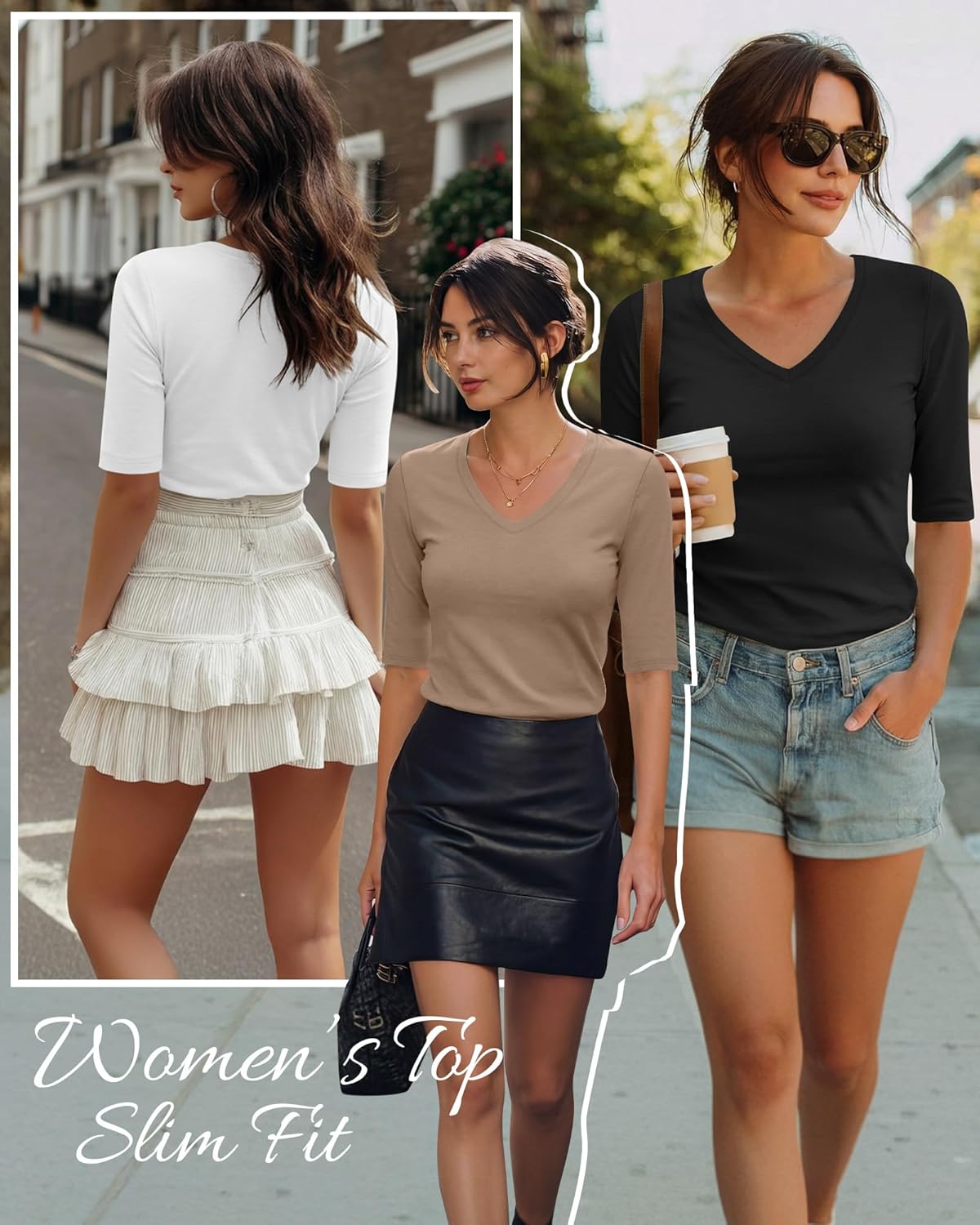 4 Pack Women’s Half Sleeve Shirts V Neck Tops Elbow Length Slim Fit 1/2 Sleeve T Shirts Casual Summer Tees