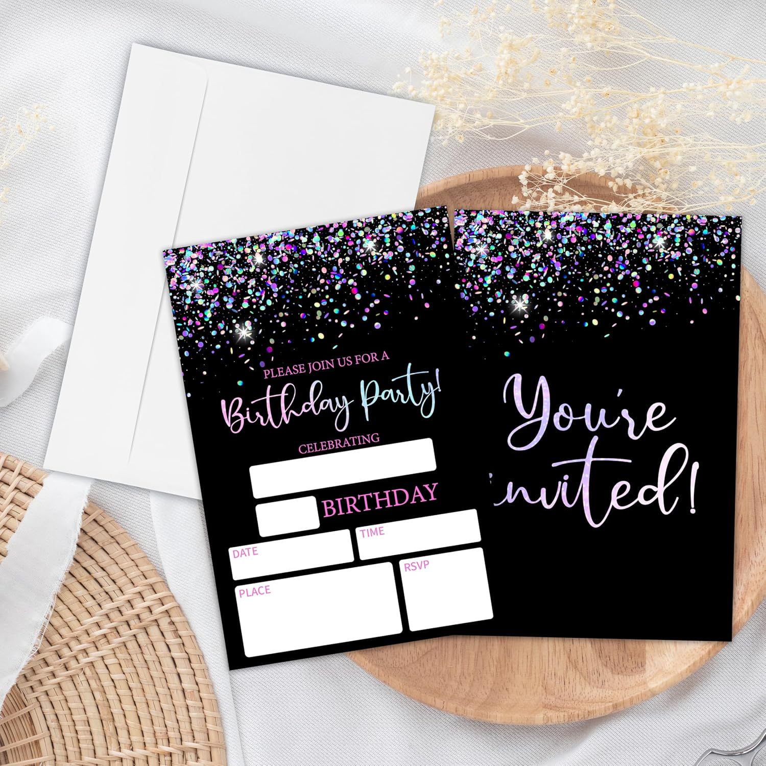 4″ x 6″ Black Glitter Birthday Invitation Cards – 20Pcs Double Sided Invitation Cards & 20Pcs Envelopes – Modern Birthday Party Invites For Boys, Girls – A05