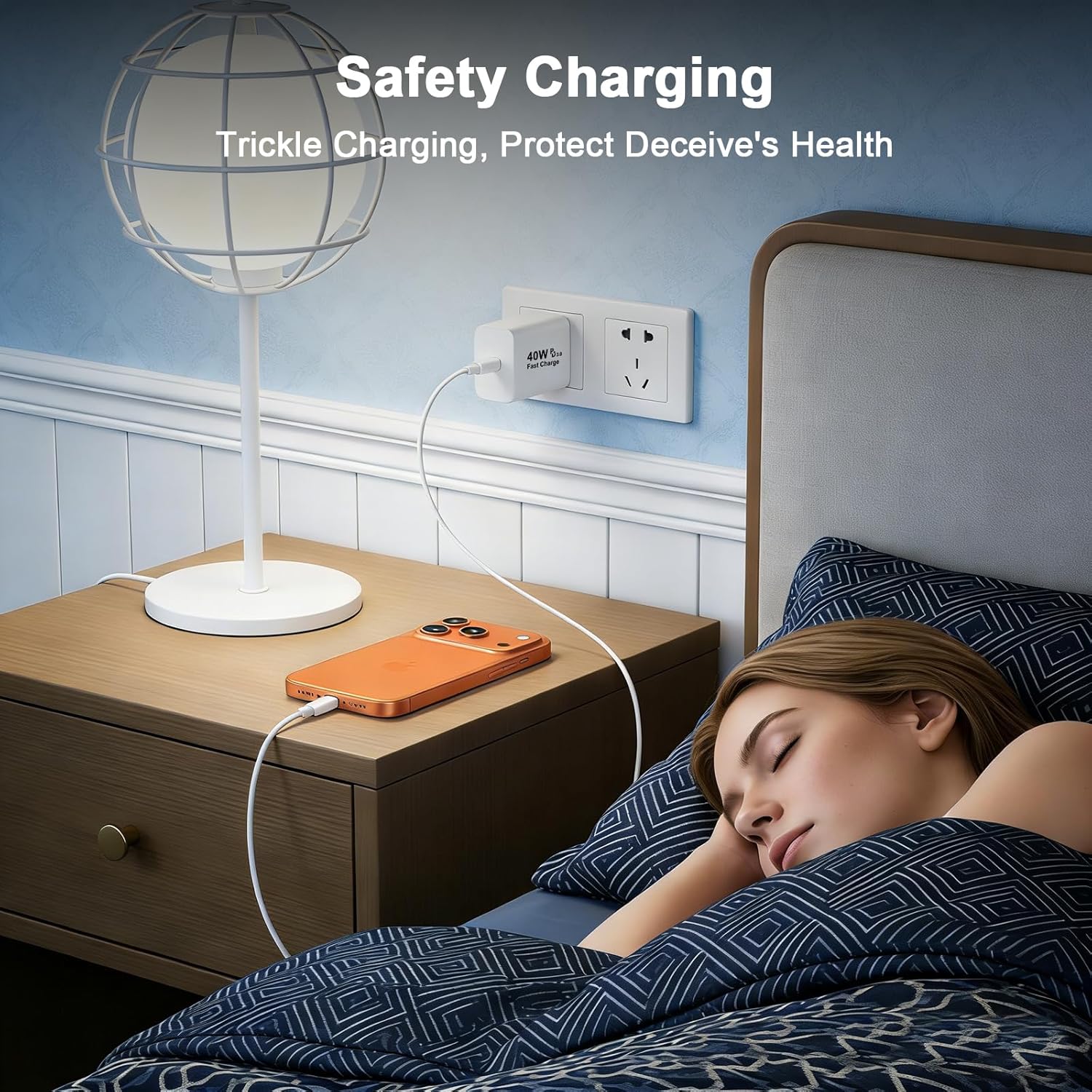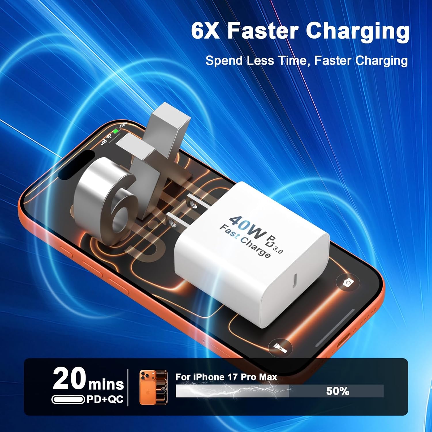 【Safety and Reliable iPhone 17 Charger Block】 The The shell of 40W USB C iPhone 17 Pro Max fast charger boxis made of high quality ABS material, heat resistance and low temperature resistance, chemical resistance and excellent electrical properties. The 40w type c charger has multi protection safety system protect your devices from over current, over voltage, short circuit and overheating, ensure charge your device safety and longevity.