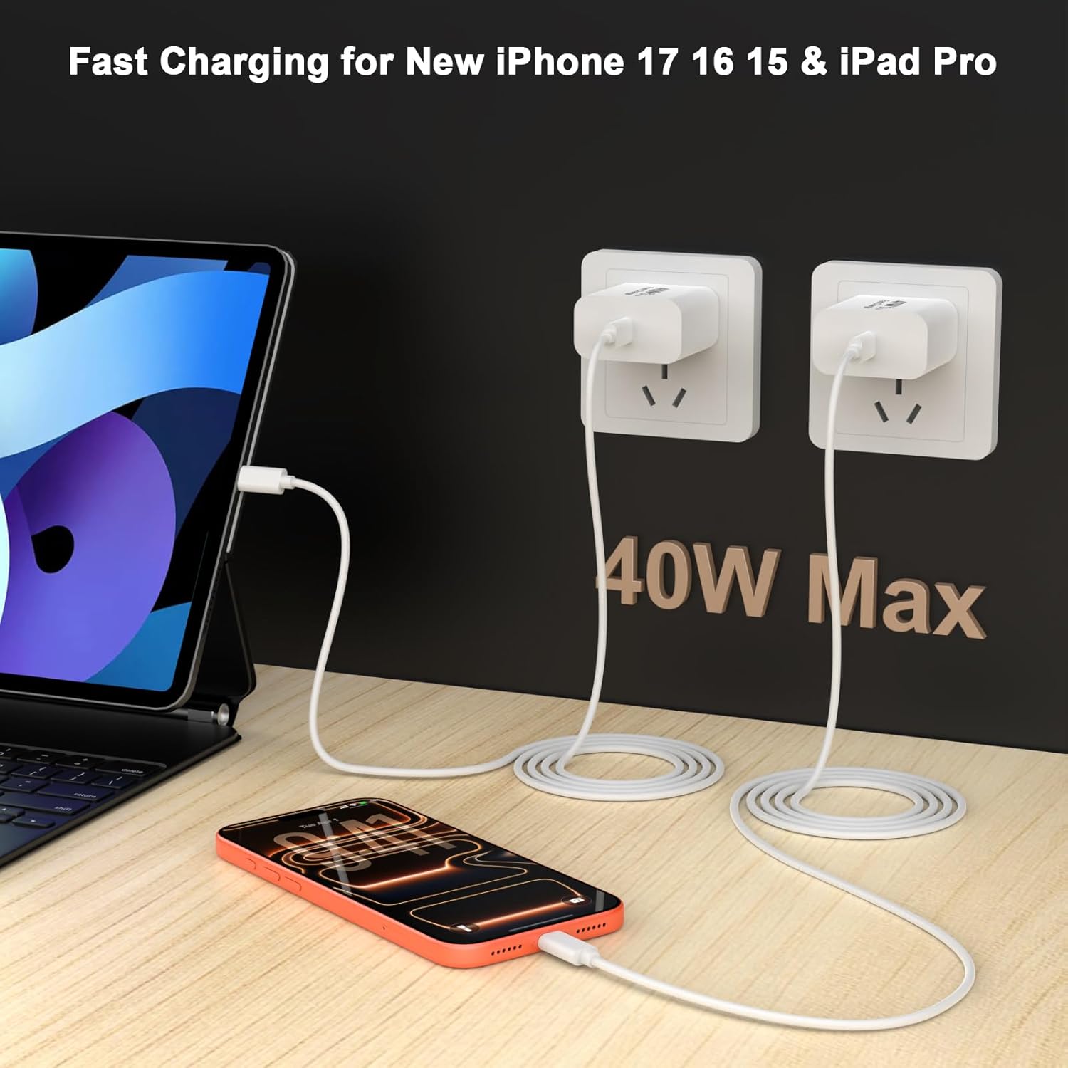2 Pack 40W USB-C Power Adapter Fast Charging Block Compatible with New iPhone 17 16 15 14 13 12 11 Series and More.