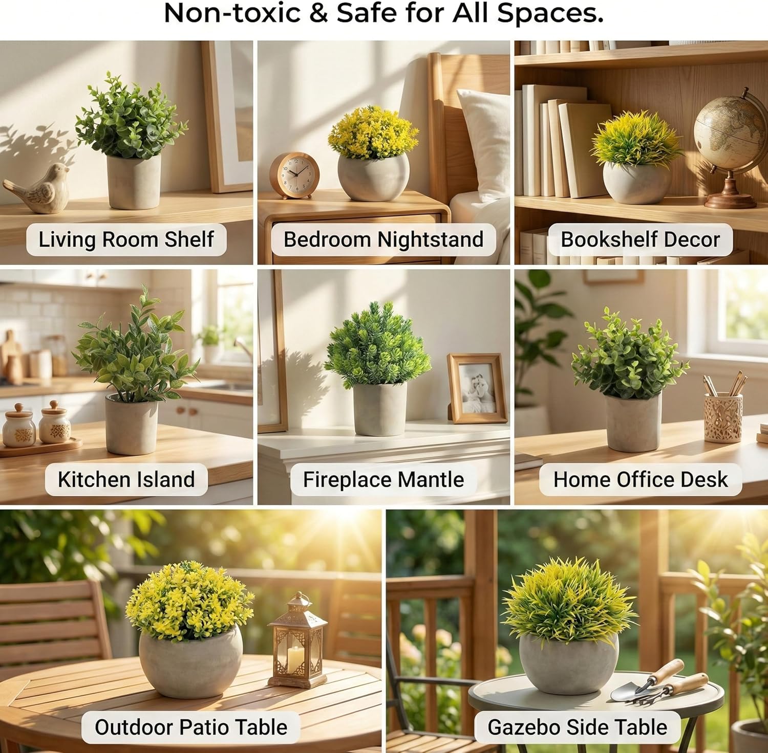 ② Perfect for Shelves, Desks & Multi-Scene Decor: Designed to fit snugly in compact spaces, this set includes both tall cylindrical and short round pots. Use these artificial plants as elegant shelf decor or bookshelf decor, on office desks, bathroom counters, or tabletops. Combine two sets to create a stunning tiered mini garden—ideal for apartments and small spaces.