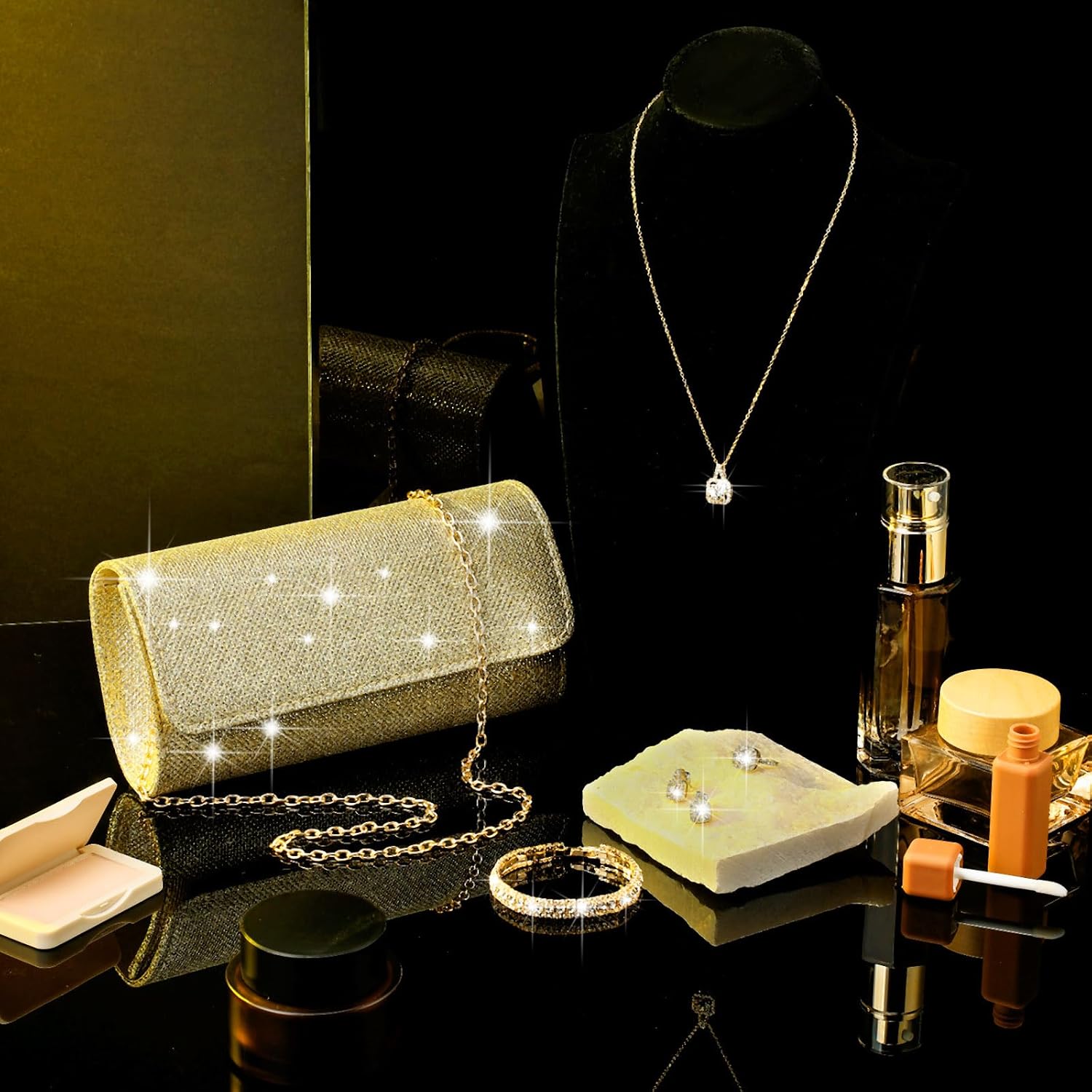 Be the first to review “5 Pcs Rhinestone Jewelry Set for Women Glitter Bling Clutch Purse Necklace Earrings Bracelet Ring for Bride Wedding”