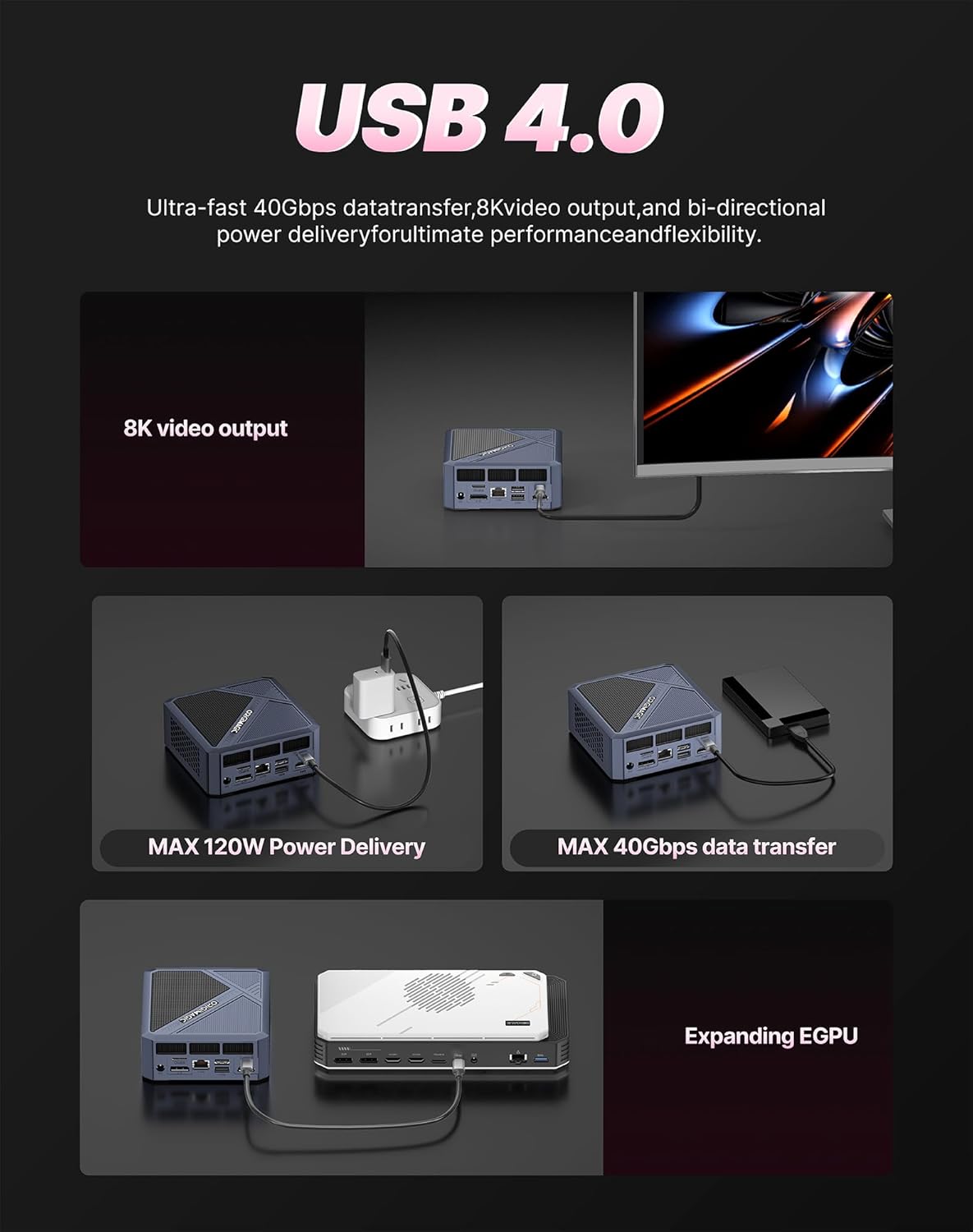 【Oculink High-Speed Interface】 Easily connect an external graphics card via the Oculink/USB4.0 interface. Compared to USB4, the Oculink interface has lower performance loss and internal screen loss. OCuLink does not support hot plugging, so you must power off and reconnect (power off – connect OCuLink – power on the eGPU – power on the computer).