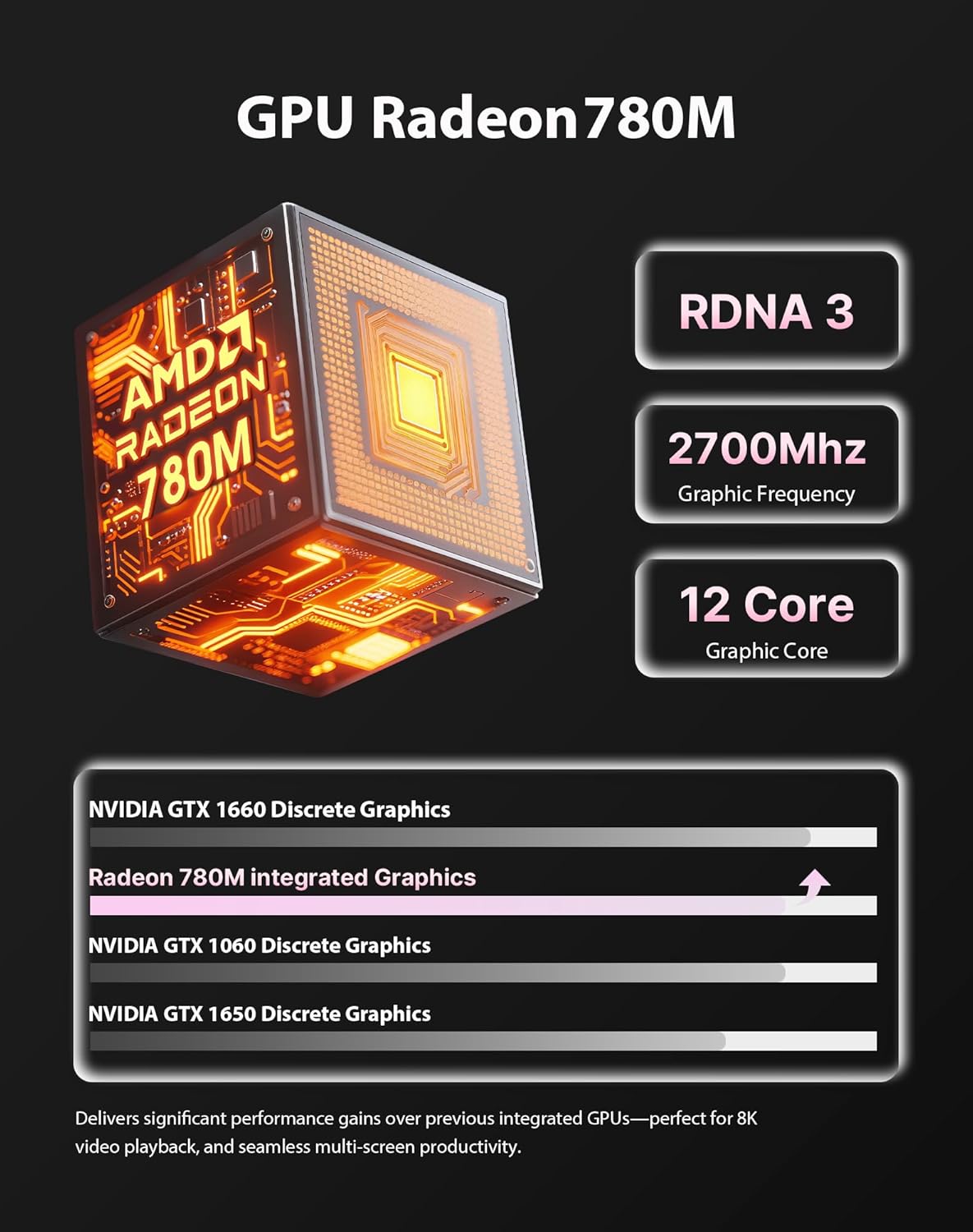 【2700MHz Radeon 780M GPU】The integrated Radeon 780M GPU has performance 30% higher than a 1050Ti, and comparable to that of a GTX 1650-1660. Easily handle gaming, 8K video editing, and complex design work without a discrete graphics card. If you need even more graphics muscle, simply connect an external GPU via the Oculink/USB4.0 (8K@60Hz) Type-C port.