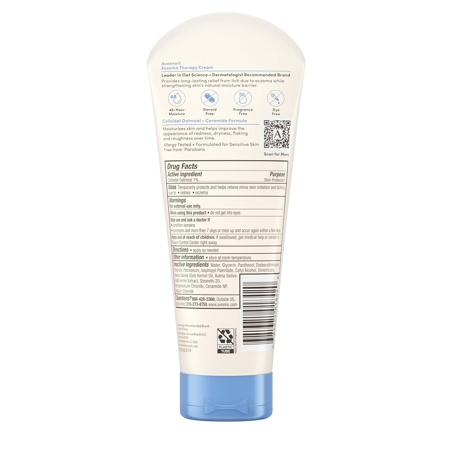 ECZEMA THERAPY CREAM: 7.3-ounce tube of Aveeno Eczema Therapy Daily Moisturizing Body Cream with 1% colloidal oatmeal is clinically proven to relieve dry, itchy skin due to eczema and improve the appearance of redness, flaking and roughness over time