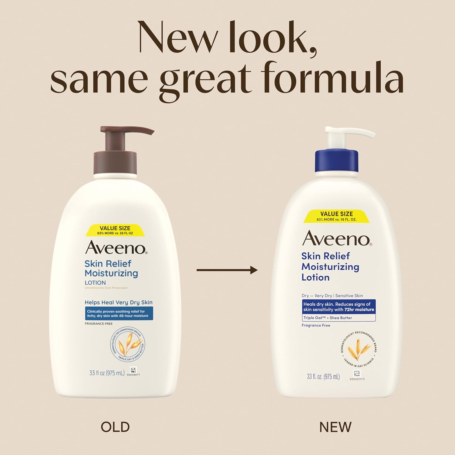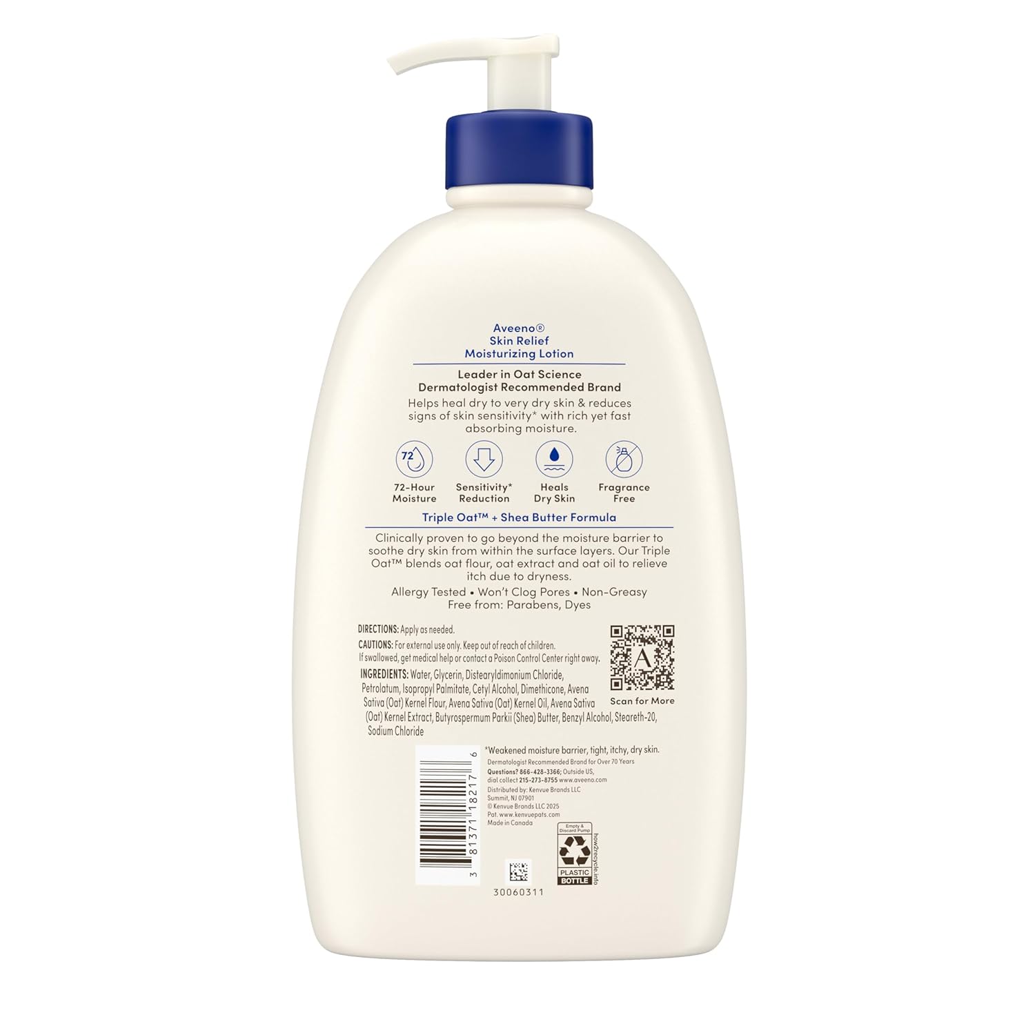 Aveeno Skin Relief Moisturizing Lotion Heals Very Dry, Sensitive Skin, Fast-Absorbing Body Lotion with Triple Oat & Shea Butter, Fragrance Free, Non-Comedogenic, Value Size, 33 fl. oz