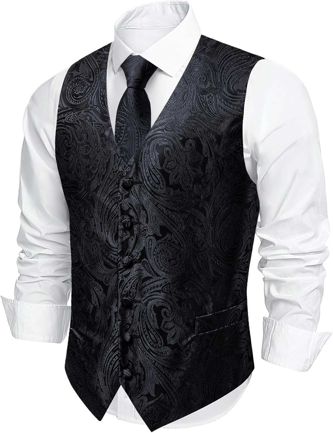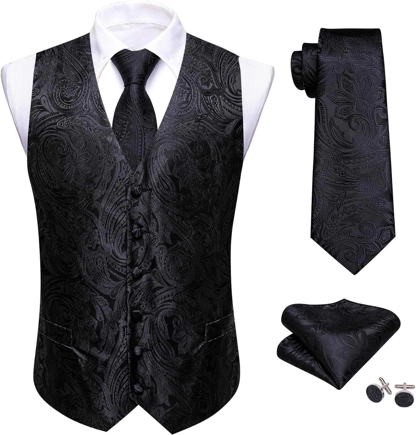 Barry.Wang Men’s Suit Vest Formal/Leisure Paisley Jacquard Silk Tie Pocket Square Waistcoat Set Wedding 5PCS
