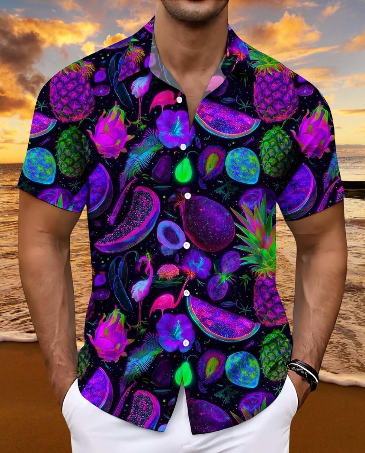 Unique Pattern Hawaiian Shirt, Summer Vacation Cruise Tee, Fruit Print Beach Tee, Tropical Button Up Shirts, Holiday Shirts for Men, Hawaiian Holiday Shirts, Casual loose fit Shirt, Button up Shirts, Printed shirts, Stylish Shirts, Short Sleeve Button Up Tops, breathable shirts for men, lightweight tops, Cruise Ship Tee