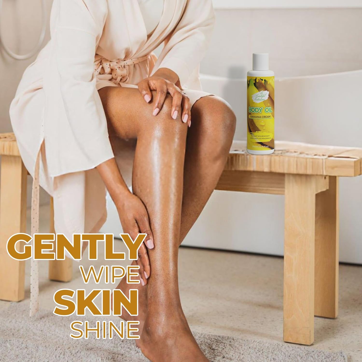 body oil Infused with the delightful scent of banana✨ Improves Skin Elasticity Over Time Vitamin E and fatty acids help maintain firmness and reduce the appearance of fine lines or stretch marks with consistent use.
