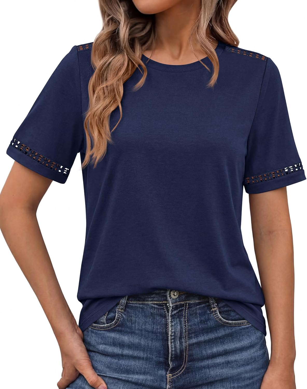 BTFBM Womens Summer Tops Lace Short Sleeve Shirts 2026 Spring Casual Loose Crew Neck Cotton Knit Cute Business Blouses