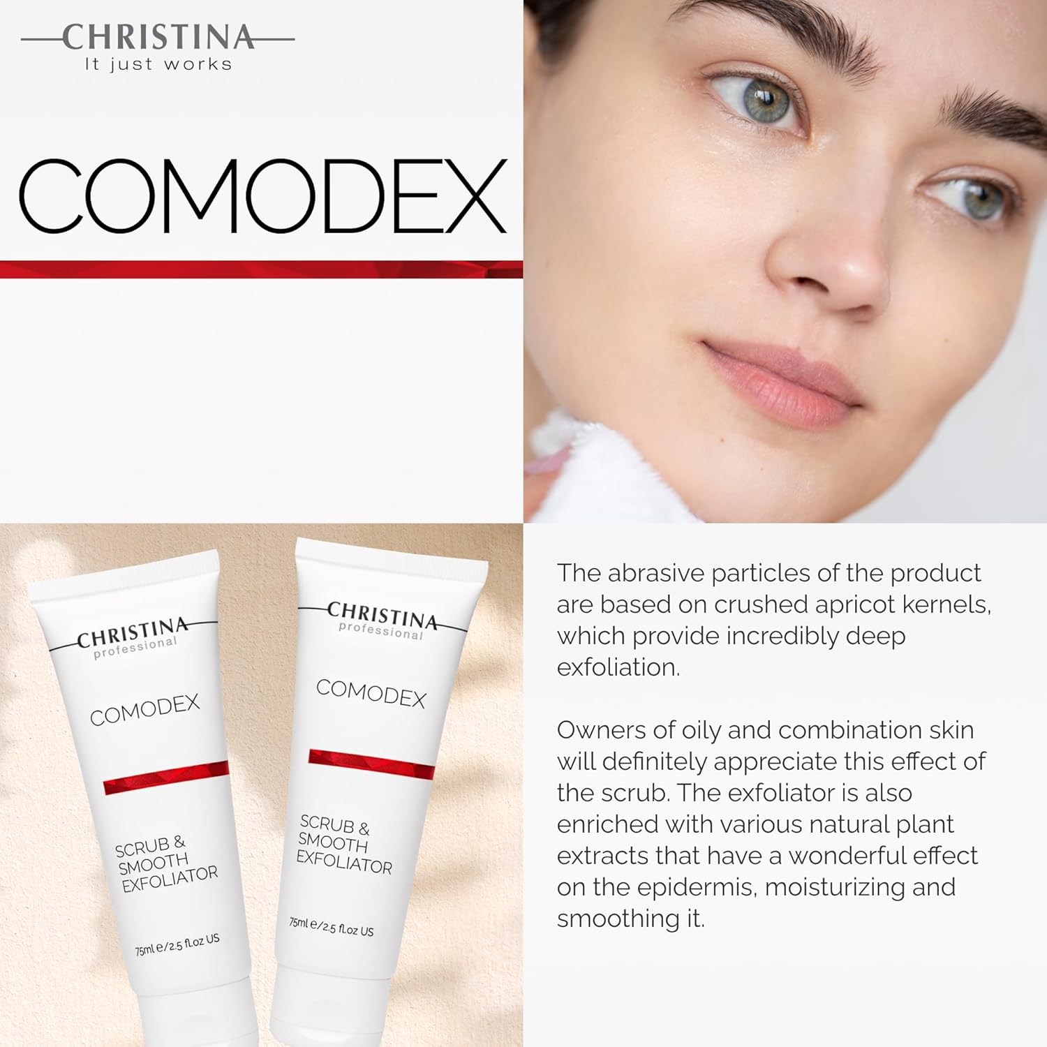 Christina Comodex Scrub & Smooth Face Exfoliator | Fights Oiliness, Visible Pores and Dark Spots | Exfoliate for face Removes Dirt and Oil Residue | Even-Toned Skin Effect 75ml