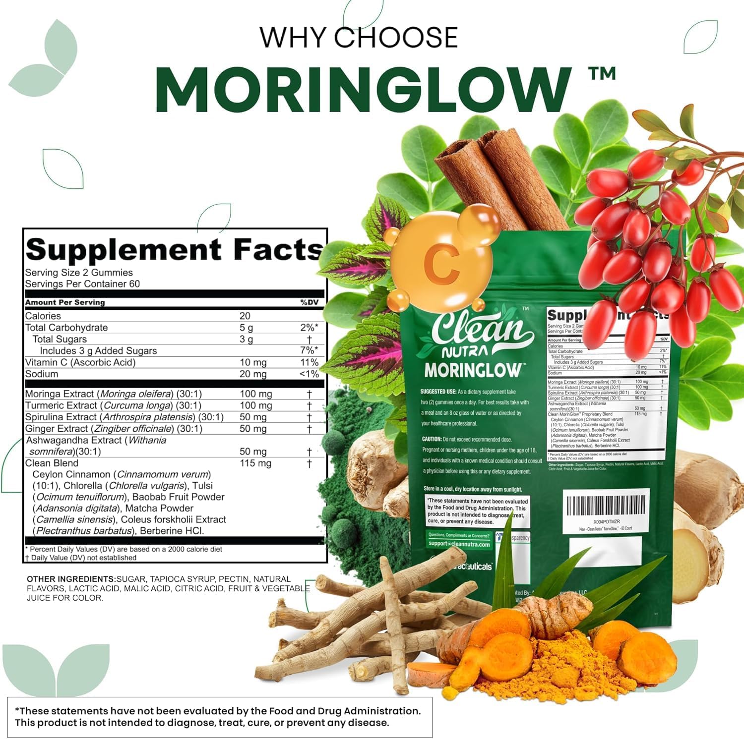 Clean Nutra Moringa Gummies | Pure Moringa Powder Supplement + Ashwagandha Turmeric Spirulina & Ginger Energy, Skin, Immune & Gut Health Green Superfood – Moringa Capsules Alternative
