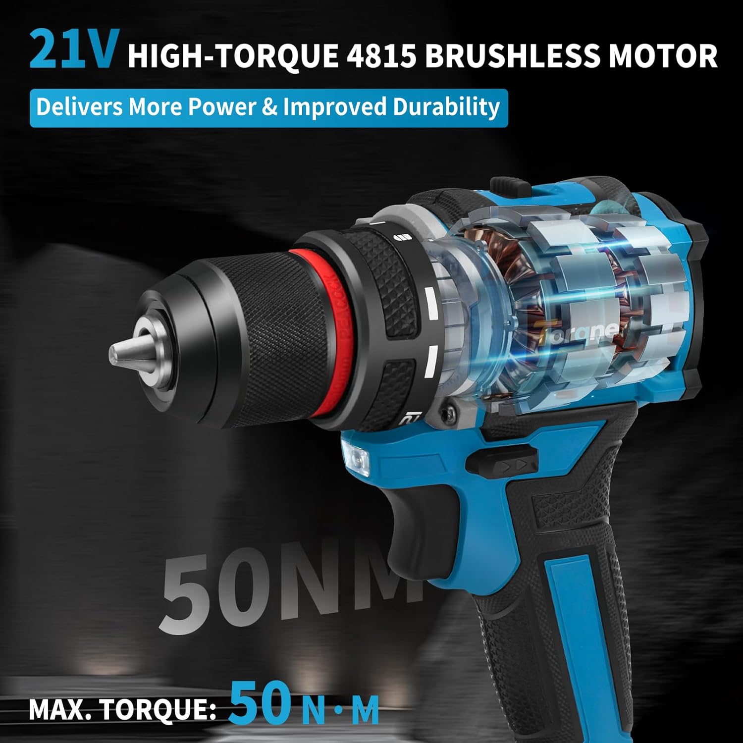 【High-Power Brushless Motor】This cordless drill from the tool kit is equipped with a 21V brushless motor, delivering a peak torque of 50 N·m (443 inch-pounds). It provides a motor lifespan 5 times longer than traditional brushed motors, making it ideal for a wide range of household and garden tasks.