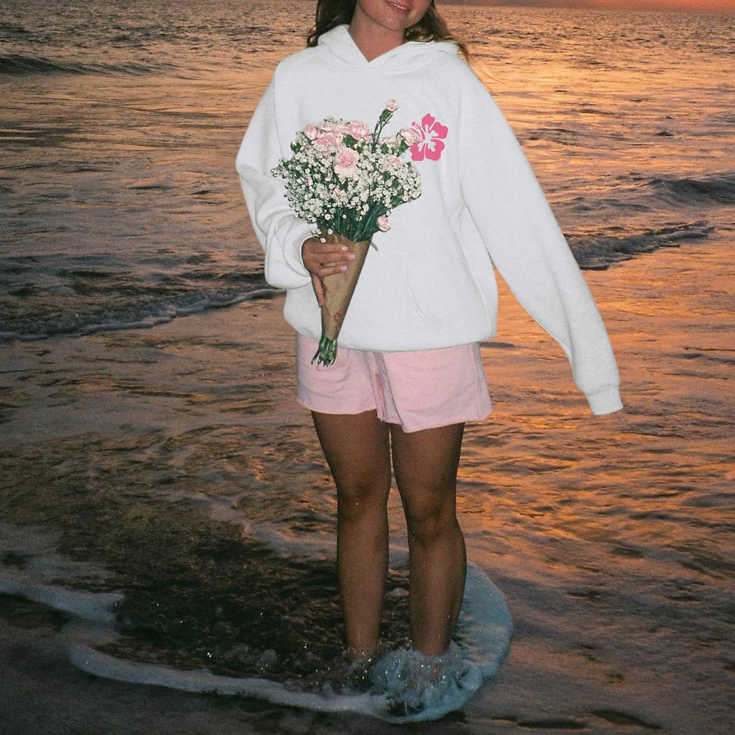 Cute Pink Flower Hoodie for Woman Preppy Sweatshirts Trendy Puff Print Letter Graphic Hoodies Casual Pullover Tops