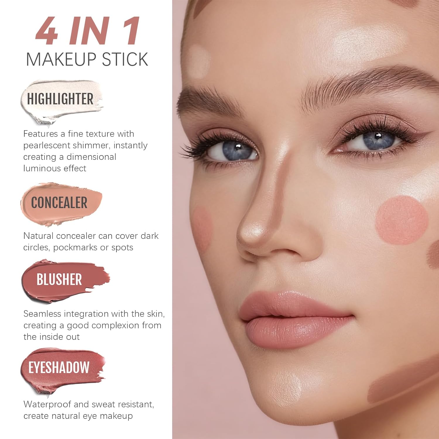 Multi-Use Makeup Stick:One stick, four functions: highlighter, concealer, eyeshadow, and blush. No need to carry multiple products. Brighten your face, enhance your eye makeup, conceal under-eye circles, and boost your complexion—all in one step