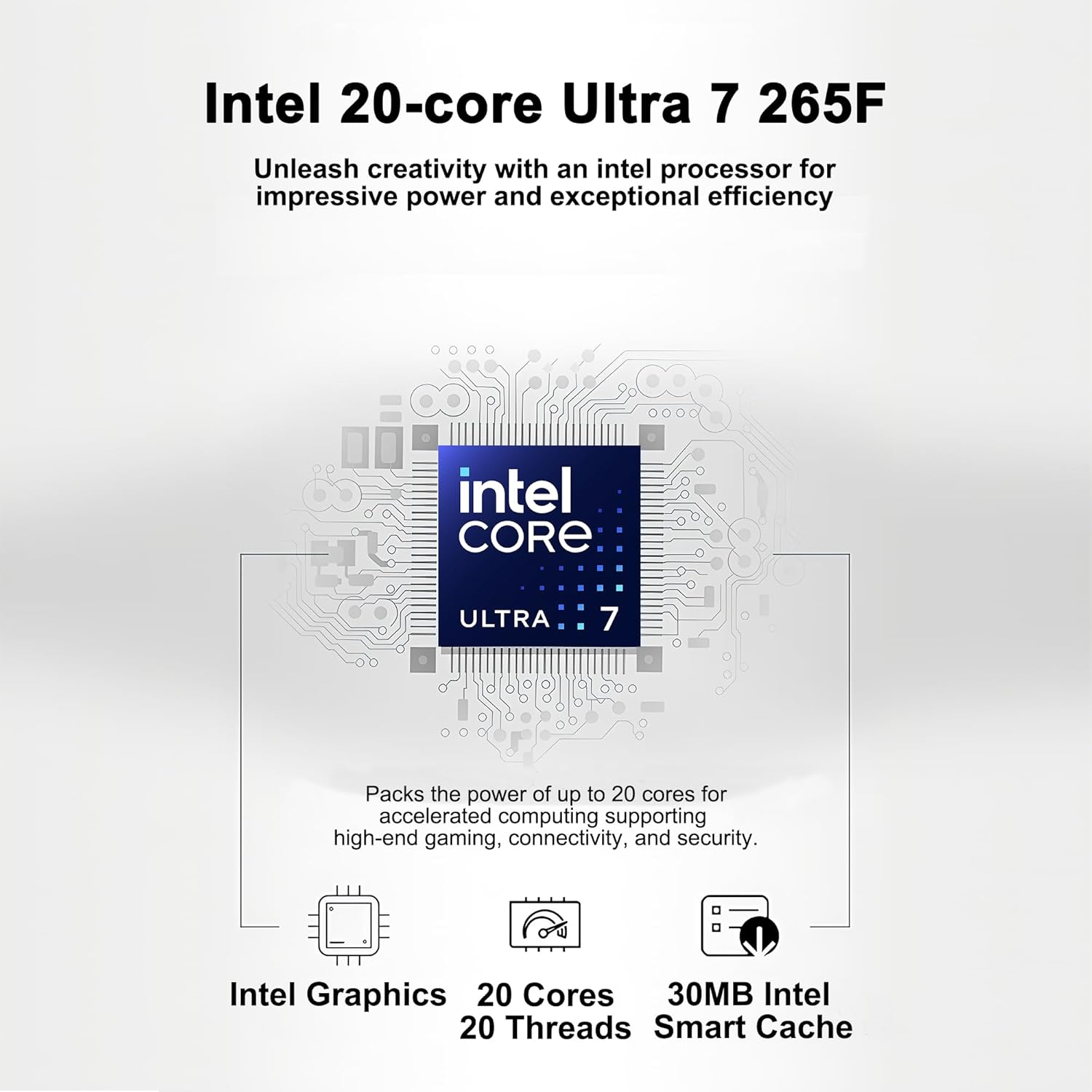 Intel 20-core Ultra 7 265F (Base Clock 2.4GHz, Max Boost Clock Up to 5.3GHz, 30MB SmartCache, 20 Threads)