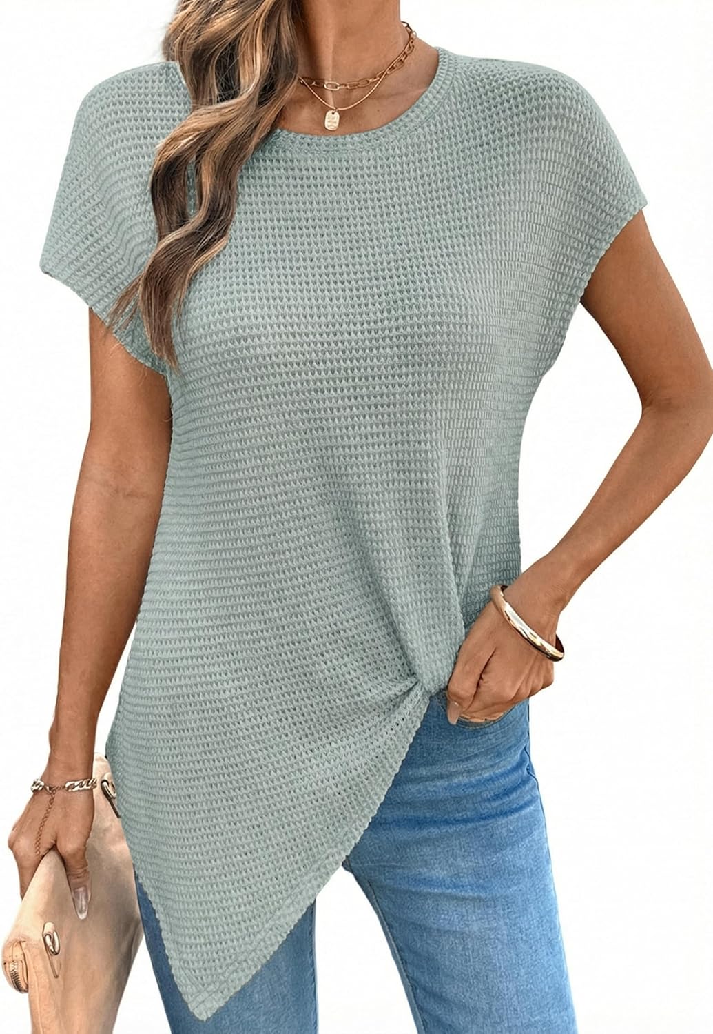 Stay stylish and comfortable with the waffle knit womens tops. Featuring soft short sleeves, knot front,irregular hem and a classic crewneck, these summer tops for women offer a lightweight, flattering fit ideal for both dressy casual and everyday outfits.