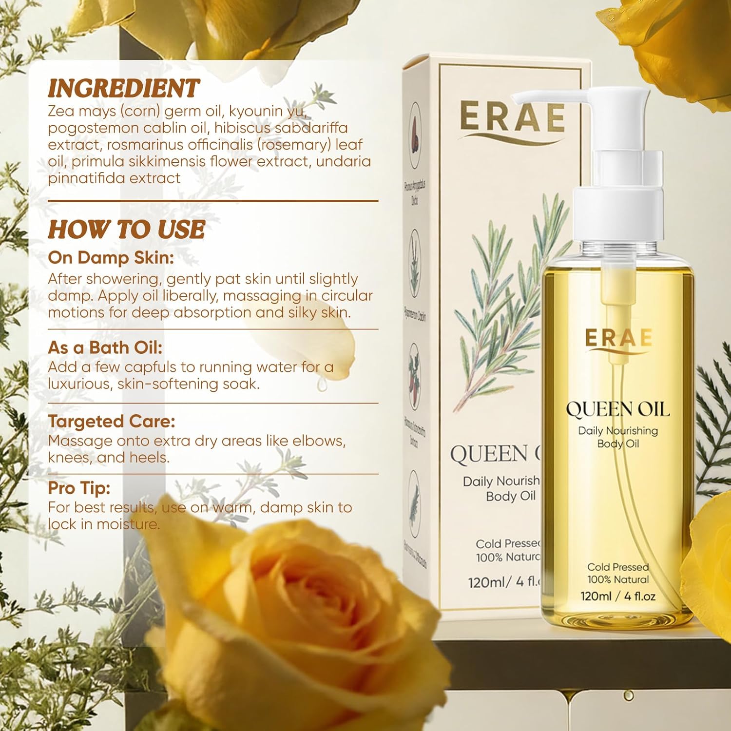 ERAE Queen Oil, Cold-Pressed Botanical Body Oil, Daily Nourishing Lightweight Moisturizing Oil for Arms, Tummy & Thighs, 2 Pack 120 ml / 4 fl oz Each