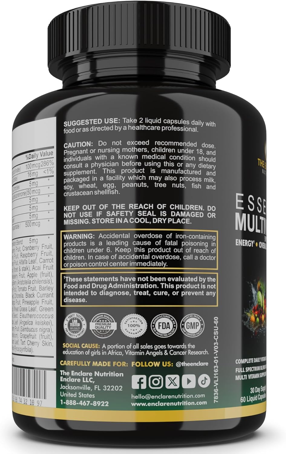 ESSENTIAL MULTIVITAMIN FOR WOMEN AND MEN Enclare Essential Multivitamin supplement is a complete adult multivitamin for women and men who want reliable nutrition. This thoughtfully balanced multivitamin for men and women supports overall health and long-term wellness with essential vitamins, minerals, and carefully selected natural ingredients—designed for consistency. Unlike many one-size-fits-all multivitamin supplements, this womens multivitamin and mens multivitamin focuses on nutrients your body actually uses every day. You’ll find key vitamins including Vitamin A, Vitamin C, Vitamin D3, and Vitamin E, plus a complete vitamin B complex: B1 – Thiamin, B2 – Riboflavin, B3 – Niacin, B6, B12, Folate – Folic Acid, Biotin, and Pantothenic Acid — supporting normal energy metabolism and cellular function as part of daily nutritional support. Essential Multivitamin mineral support includes Iron, Zinc, Iodine, Selenium, Copper, and Manganese, and high rated minerals such as Calcium, Magnesium, and Potassium to help you feel your best everyday. A 42 fruit and vegetable blend complements modern diets that often fall short—our women’s multivitamin brings whole-food variety for balanced wellness support. This complete multivitamin for adults also includes metabolic and cellular support nutrients such as CoQ10 – Coenzyme Q10, Inositol, Chromium, Citrus Bioflavonoids, Rutin, and Panax Ginseng, that support how your body produces and uses energy. Essential Multivitamin liquid capsules are non-GMO, gluten-free, third-party tested, and made in a GMP-certified facility—because Enclare believes wellness should feel safe, intentional, and trustworthy. Our liquid multivitamin is a perfect mens multivitamins for men who like dependable multi vitamins and, a comprehensive vitamins for women who want full coverage in one multivitamin. Take daily as a women and men’s multivitamin for optimal health. multivitaminico adultos vitaminas para mujeres hombres multivitaminas coenzima q10