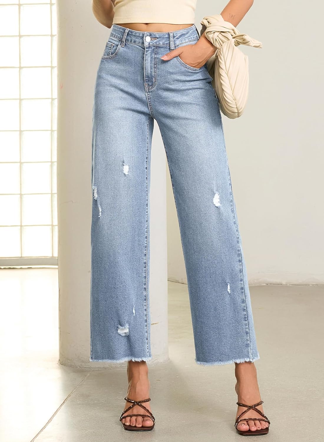 EVALESS Jeans for Women Stretchy Distressed Washed Straight Leg Frayed Raw Hem Denim Ankle Pants with Pockets