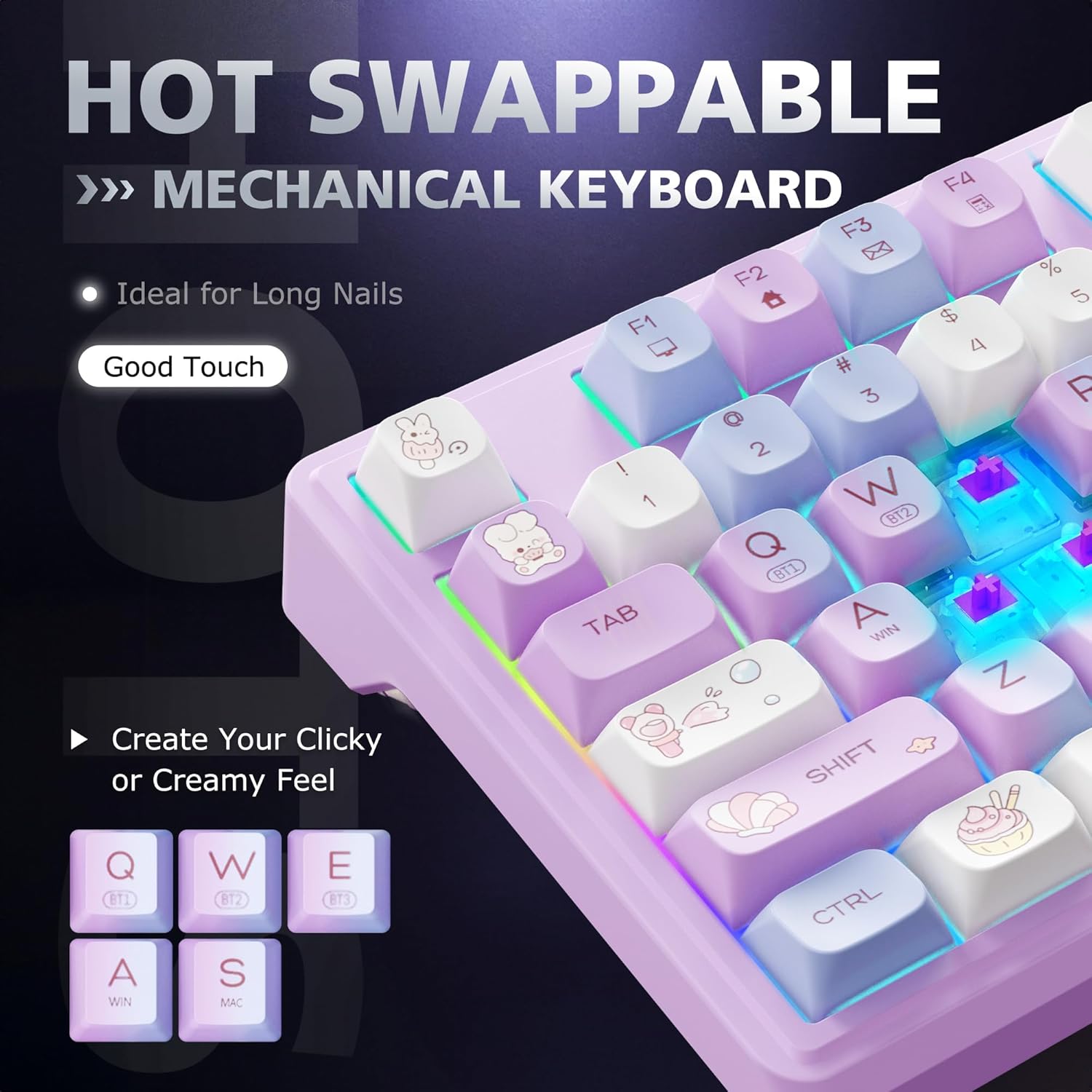 【 Creamy & Thocky Sound Hot Swappable Mechanical Keyboard 】Designed for sound lovers, this creamy keyboard delivers a soft, thocky creamy sound profile that feels smooth and satisfying. With 5-pin hot swappable sockets, it supports both 3-pin and 5-pin mechanical switches, making it an ideal hot swappable mechanical