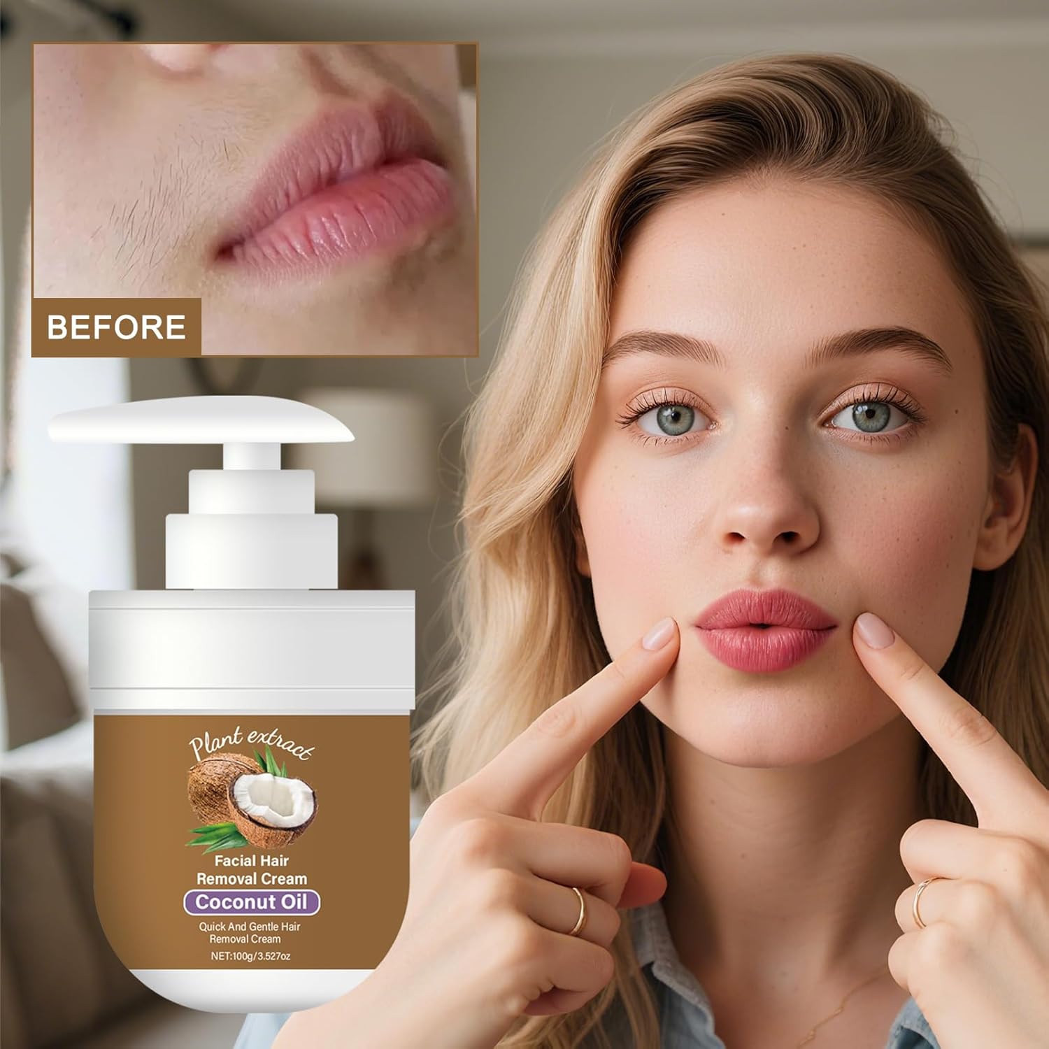 Facial Depilatory Cream, 100ML Coconut Facial Hair Removal Cream for Women for Upper Lip & Chin for Women for Sensitive Skin, Gentle and Non-irritating (/3.52 FL.OZ)