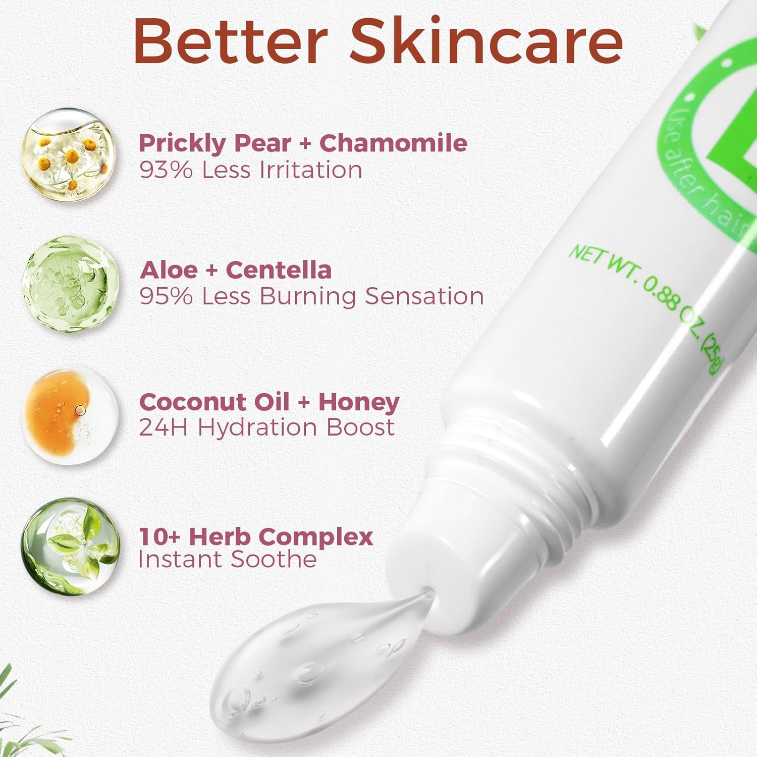 Nature’s Touch: Soothing aloe vera, hydrating coconut oil, and antioxidant-rich vitamin E to nurture skin while removing hair.