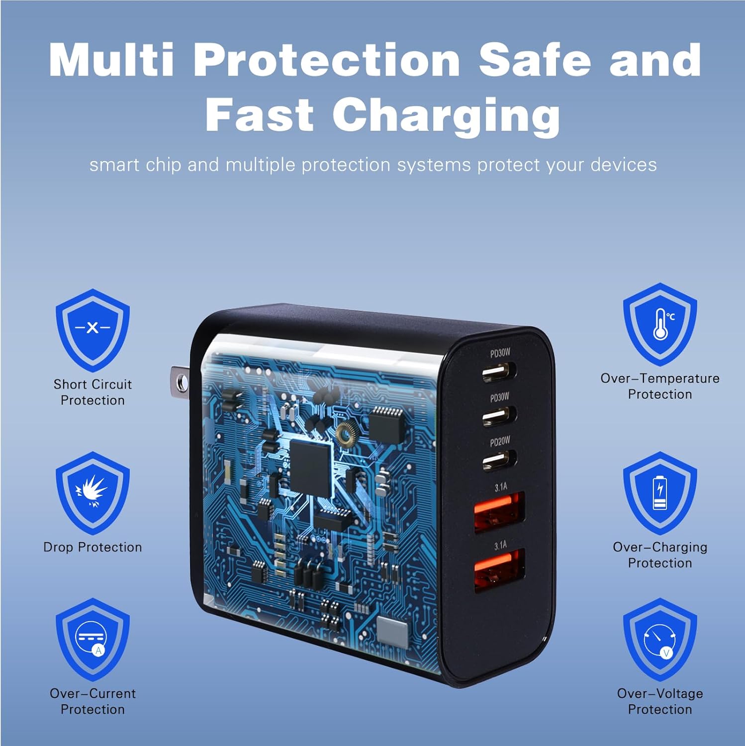 60W Fast USB C Charger Block Safe and Reliable – Fast 5-Port PD Power Delivery Adapter+QC Wall Chargers Plug,Equipped With Top-Notch Safety Features Such as Short Circuit Protection,Over Temperature Protection,Overvoltage Protection,and OverCurrent Protection,our Multiport USB C Charger Block,Which is Made of ABS + PC Fireproof Material,Guarantees a Secure Charging Experience.With CE,FCC.and RoHS Certifications,Allowing You to Power Your Devices Confidently.