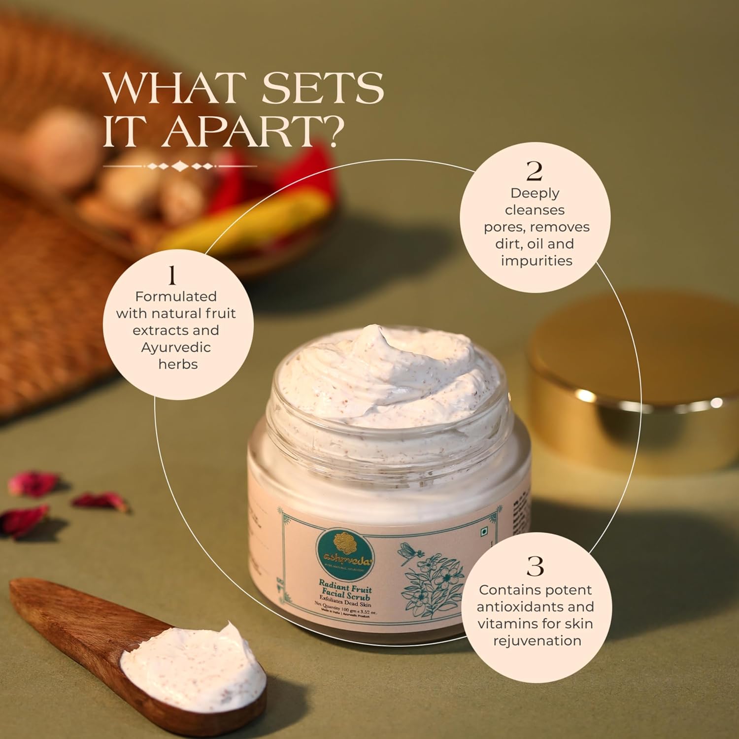 Cleaning your face with natural ingredients is pure bliss. Ashpveda Radiant Kashmiri Date Fruit Facial Scrub offers the same pure and natural experience through its core ingredients like date fruit, rose flower and honey. It removes impurities, revitalizes the skin and helps retain skin moisturizer. Ashpveda Radiant Kashmiri Date Fruit Facial Scrub works as a natural exfoliator and keeps bacteria at bay. Indulge your skin with the revitalizing touch of Ashpveda Fruit Facial Scrub. Infused with the goodness of natural fruit extracts, this gentle exfoliating scrub gently buffs away dead skin cells, revealing a smoother, brighter complexion underneath. Formulated with nourishing ingredients, including vitamins and antioxidants, it helps to deeply cleanse and rejuvenate your skin, leaving it feeling soft, supple, and refreshed. Treat yourself to the luxurious experience of Ashpveda Fruit Facial Scrub and unveil the radiant glow of healthier-looking skin. Perfect for all skin types, this refreshing scrub is your go-to solution for achieving a luminous complexion every day.