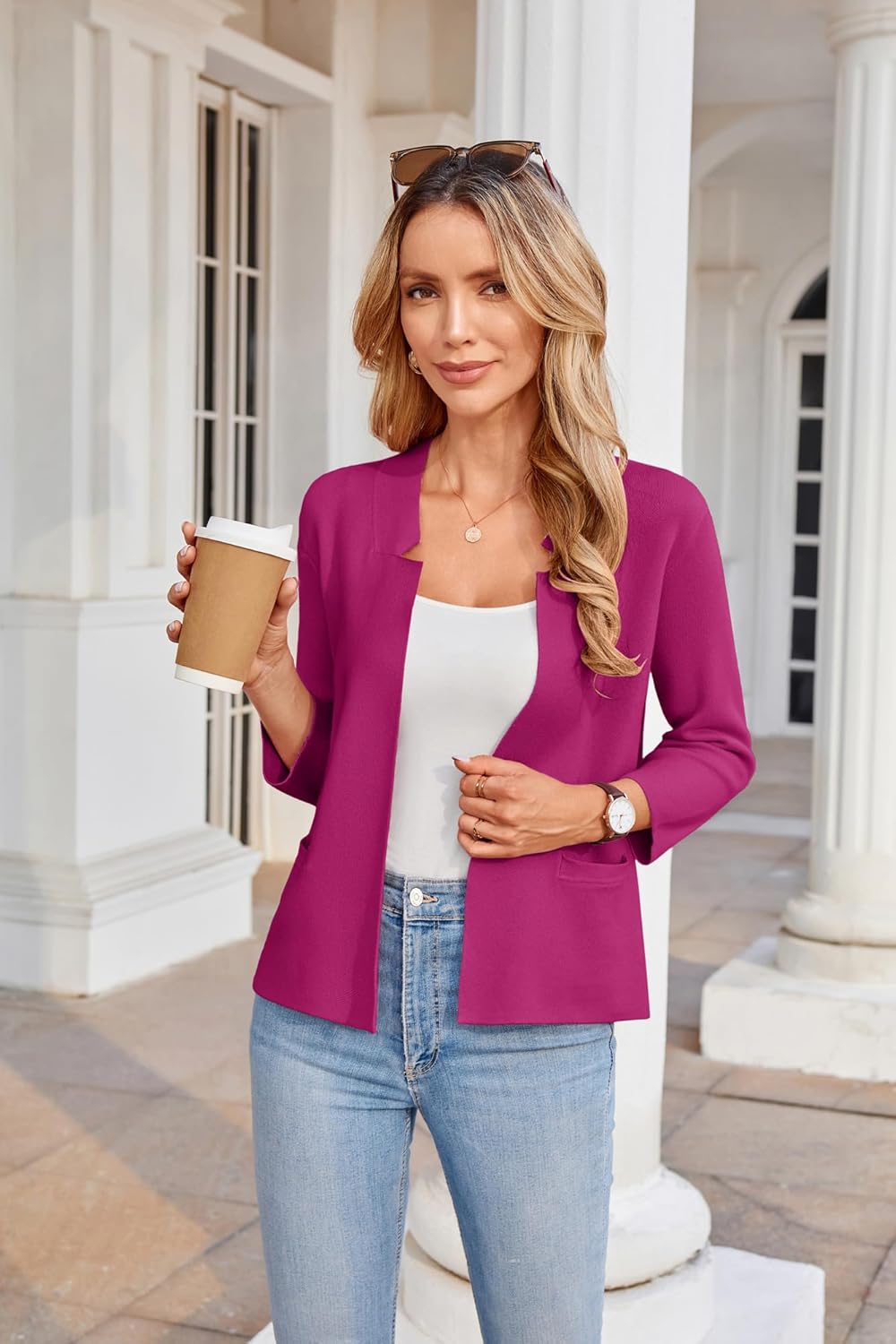 GRACE KARIN Women Sweater Blazer 3/4 Sleeve Cropped Cardigan Lightweight Notch Collar Knit Blazer Jacket Business Casual