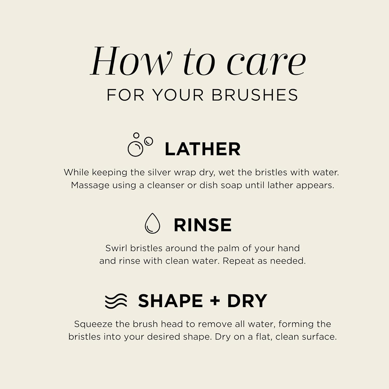 How to Care for Your Makeup Brushes: While keeping the silver wrap dry, wet the bristles with water. Massage using a cleanser or dish soap until lather appears. Swirl bristles around the palm of your hand and rinse with clean water. Repeat as needed. Squeeze the brush head to remove all water, forming the bristles into your desired shape. Dry on a flat, clean surface.