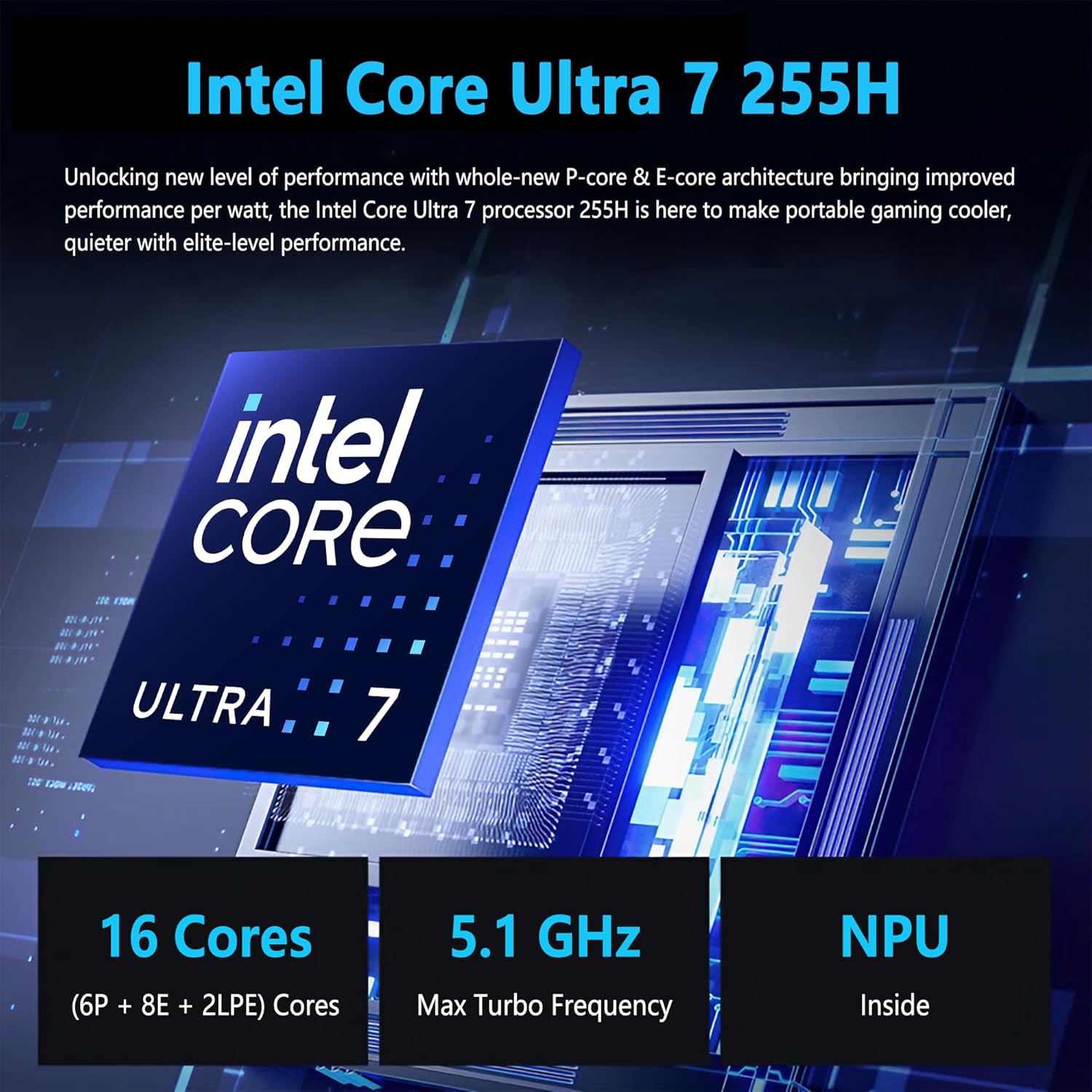 Intel Core Ultra 7 255H (24 MB Intel Smart Cache, up to 5.1GHz, 16 cores, 16 Threads); Intel AI Boost (13 NPU TOPS)