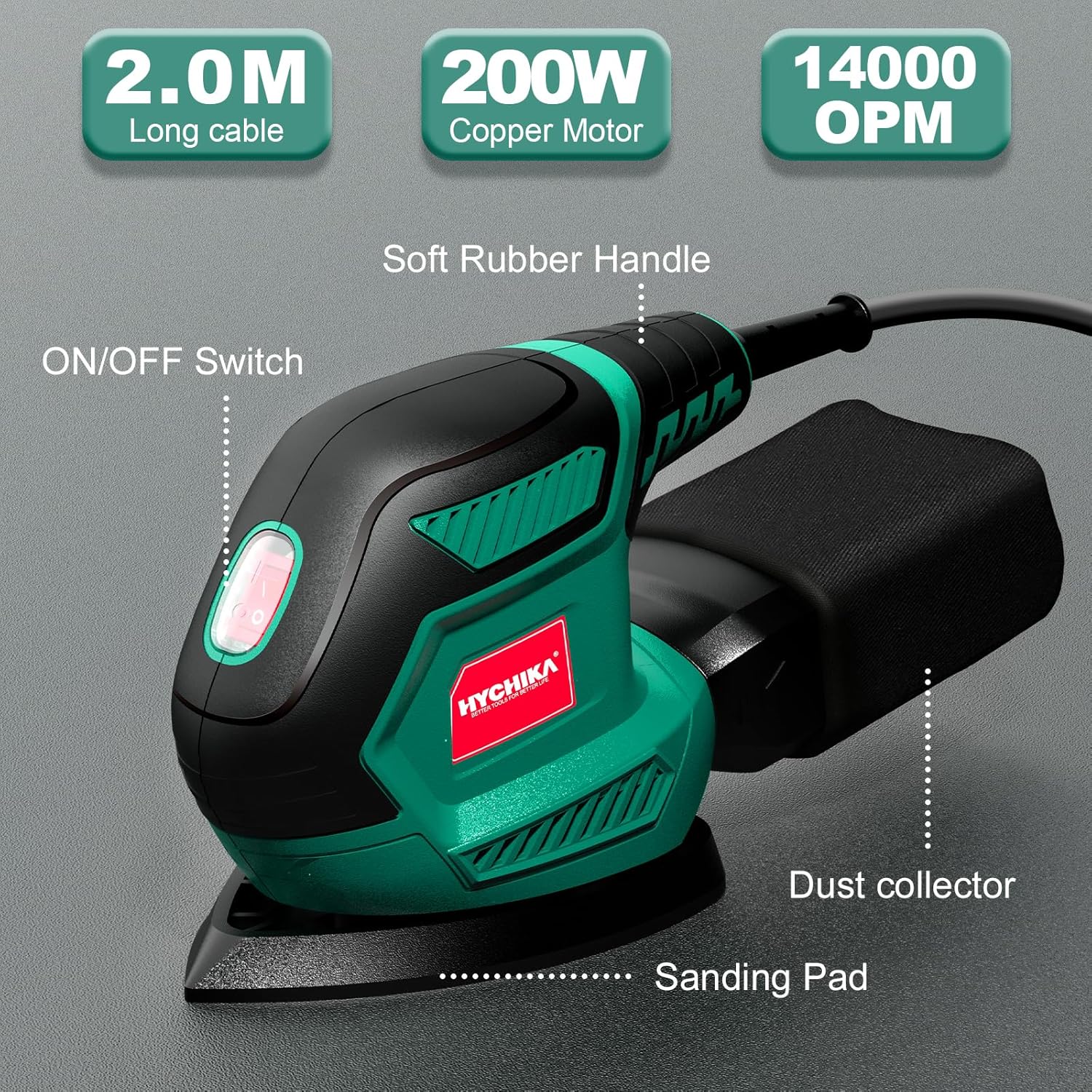 HYCHIKA Detail Sander, 14,000 OPM Compact Electric Sander Tool with 12 Pcs Sandpapers,Efficiency Dust Collection System,Suitable for Tight Spaces Sanding,Polishing,Removing Paint in Home Decoration
