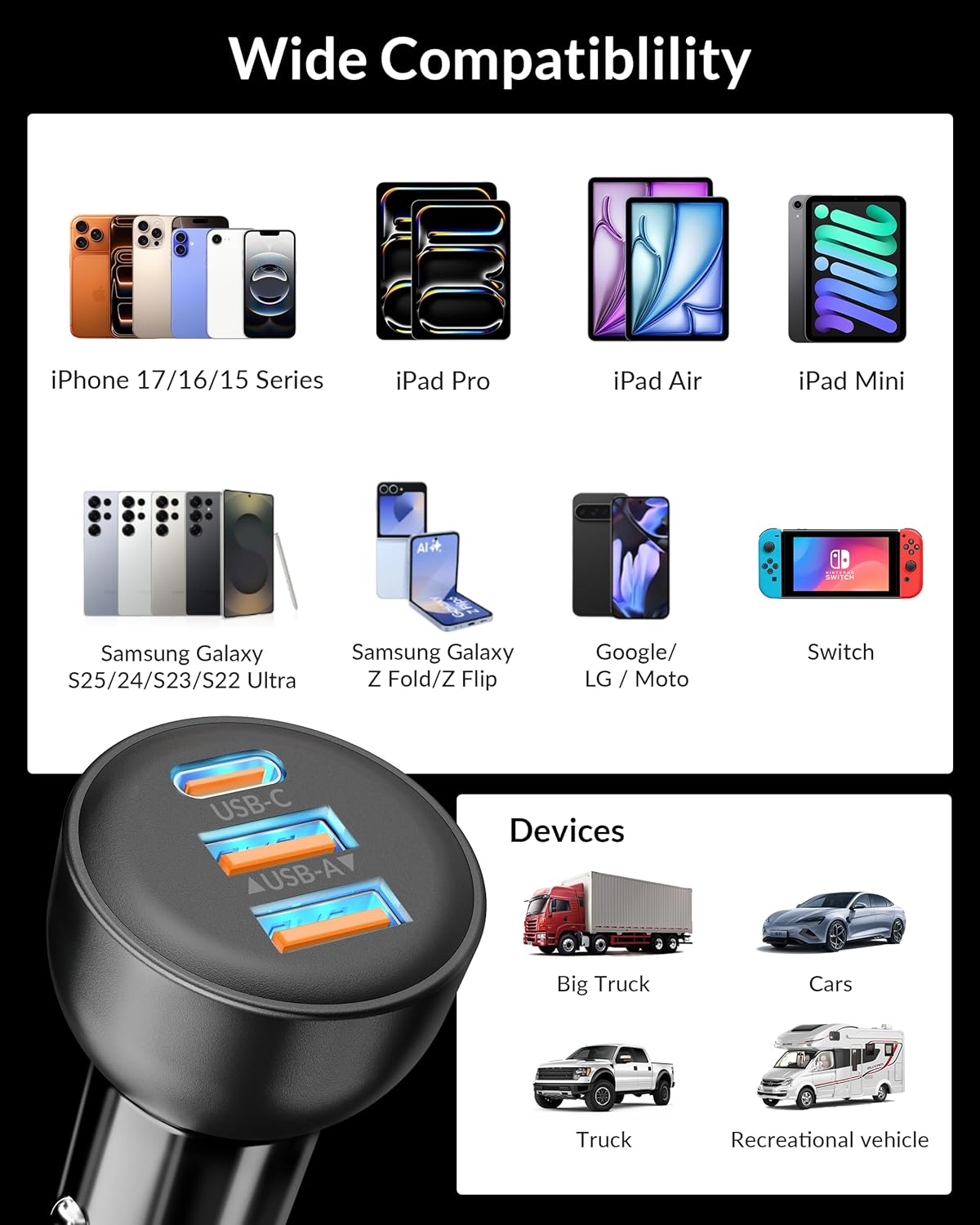 Universal Compatibility: This Type C car cigarette lighter USB charger can charge almost all USB C devices, compatible with iPhone 17/17 Pro/17 Pro Max/Air/16/16 Plus/16 Pro/16 Pro Max/16e/ 15/15 Plus/15 Pro/15 Pro Max, Galaxy S25/S24/S23/S22 Ultra, Pixel 10/9/8/7/6/5 Pro, Moto, iPad Pro/Air/mini, Android Phones, GPS, Dash-Cam and more. Applicable to all 12V-24V vehicles