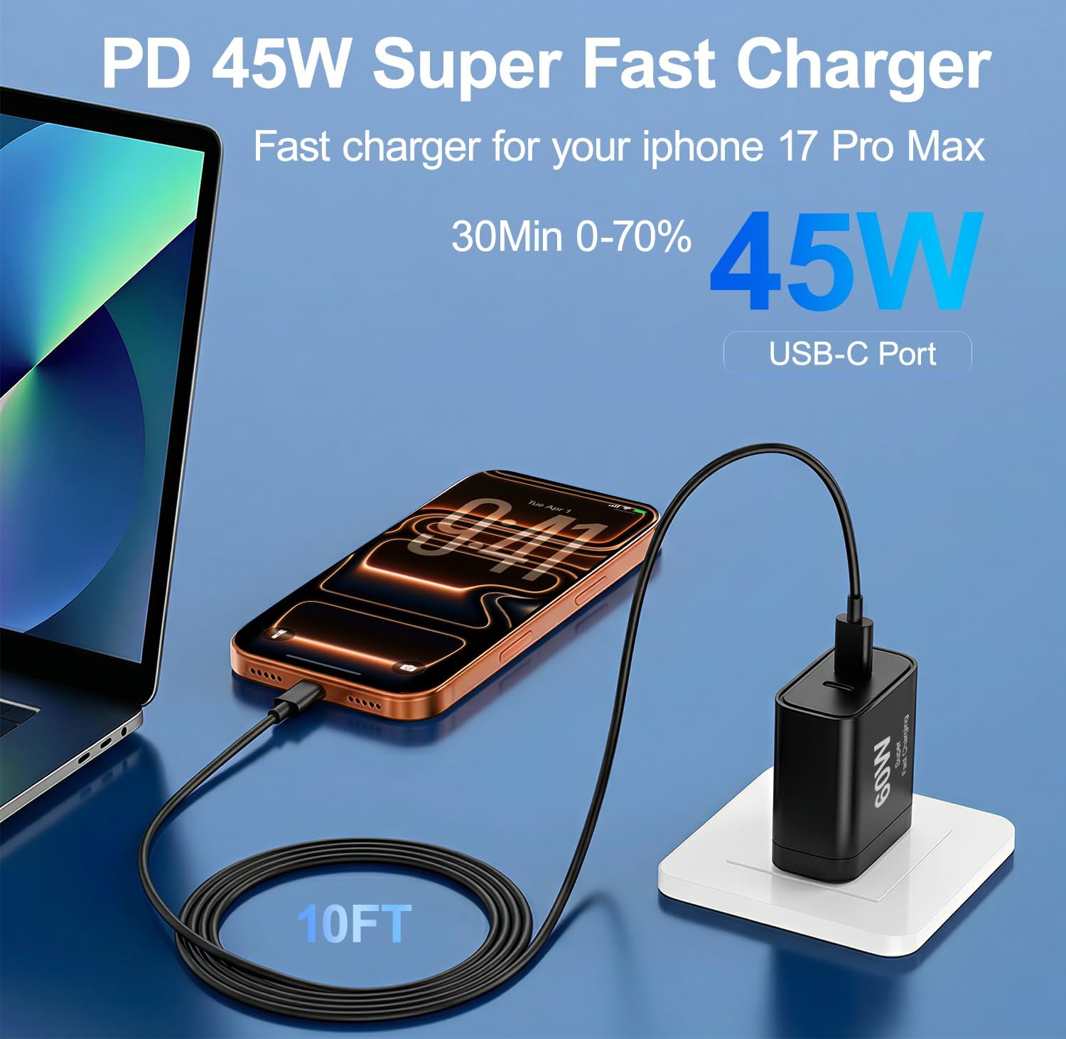 【45W iPhone 17 16 15 Charger Fast Charging】:The 45W iPhone 17 16 Fast Charger USB C Block adopts the 2025 upgraded PD 3.0 fast charging technology, with the 60W 10ft extra long USB C to USB C Fast Charger cable provides a maximum 45W output power, charging the iPhone 17 Pro Max up to 70% in 30 minutes, six times faster than the original 20W USB C Charger. And the 45W charger uses a two-port design, two ports can quickly charge two devices at the same time. When one device is connected for charging, the maximum power is 45W, providing fast charging for your iPhone 17 device.