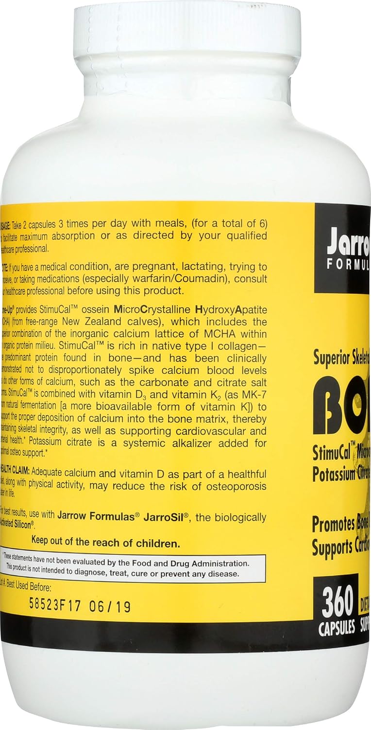 Jarrow Formulas Bone Up, a bone strength supplement, is crafted to support bone density and provide skeletal nutrition.(1) This formula includes vitamin D and K2 supplement, working synergistically as vitamin D3 with K2 enhance calcium deposition and promote overall bone health.(1) Derived from StimuCal MicroCrystalline HydroxyApatite (MCHA) sourced from free-range New Zealand calves, this supplement supports bone mineral density.(1) Each capsule provides 1000 mg of calcium and essential micronutrients, alongside vitamin C and K2 D3 vitamin supplement. Bone Up 3 per day by Jarrow 360 count capsules is formulated with vitamin D3 K2 for maintaining strong bones.(1) Vitamin D and K play a crucial role in bone health, supported by the right calcium and vitamin D levels.(1) This non-GMO and gluten-free formula fits seamlessly into your lifestyle, offering a 60-day supply with six capsules daily. These bone strength supplements are a good addition to any health regimen aimed at reducing the risk of osteoporosis later in life. Enjoy the benefits of D3K2 vitamins through Bone Up, a supplement designed for those seeking skeletal support.(1) Jarrow Formulas – Superior Science. Smarter Formulas. (1)These statements have not been evaluated by the Food and Drug Administration. This product is not intended to diagnose, treat, cure or prevent any disease.