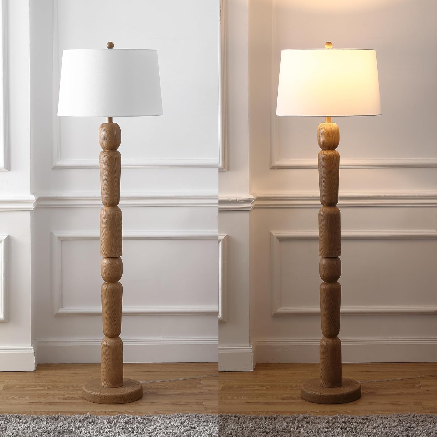 JONATHAN Y 61.5″ Antique Brown Wood Finish Resin Floor Lamp, Cottage Farmhouse Sculptural Turned Standing Lamp for Living Room, White Linen Shade, LED Bulb Included JYL5402A