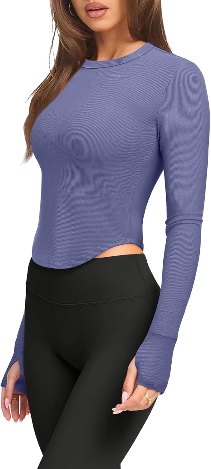 LASLULU Womens Long Sleeve Workout Tops Crop Tops Crew Neck Ribbed Slim Fitted Breathable Running Yoga Going Out T-Shirts