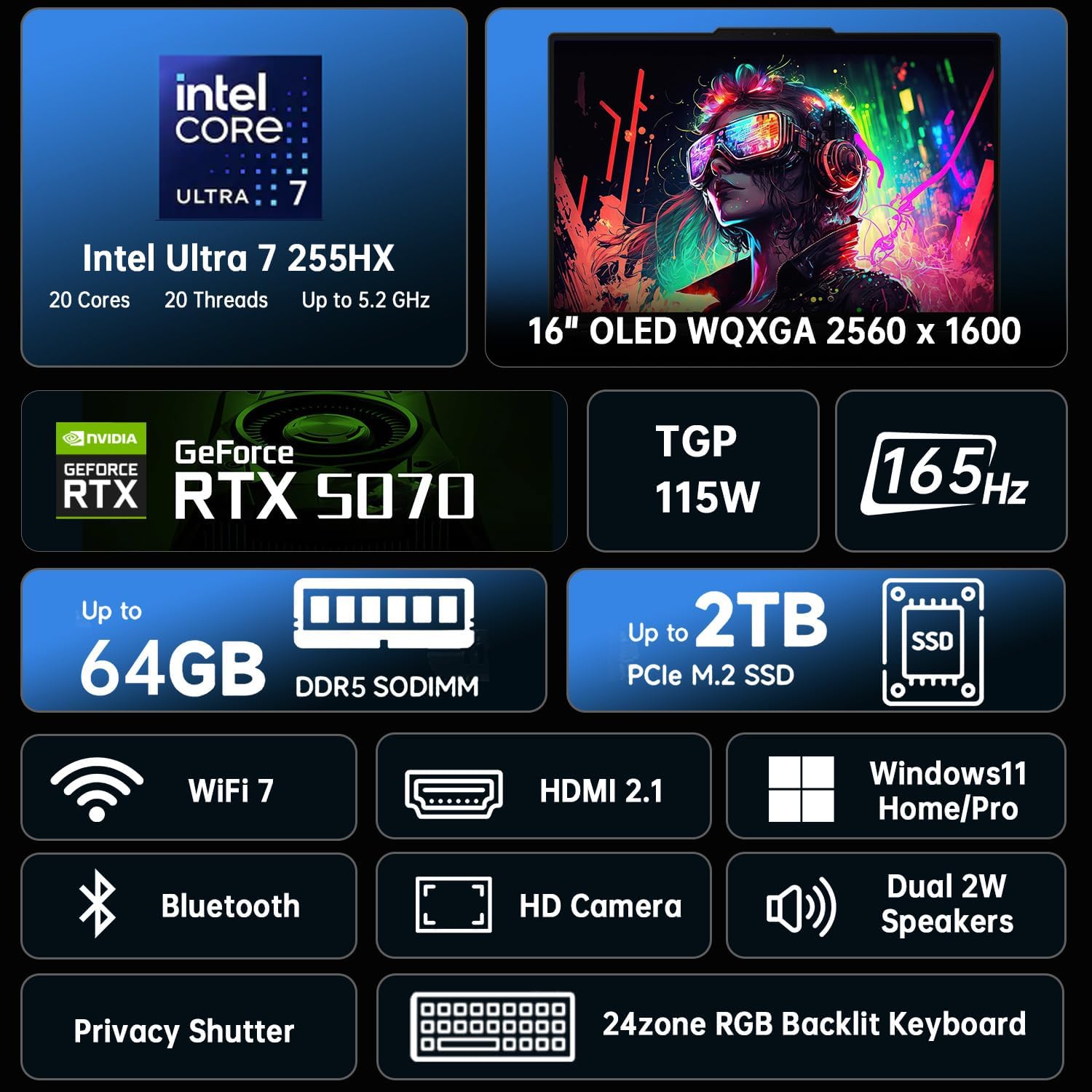 【Ultra Performance with Intel Ultra 7 & NVIDIA RTX 5070】The combination of the Intel Core Ultra 7 255HX ( 20C/20T,up to 5.20 GHz) processor and the NVIDIA GeForce RTX 5070 laptop GPU with 8GB GDDR7 memory delivers unparalleled speed and graphics power for everything from 4K rendering to immersive gaming.Built to dominate the latest games and professional creative software.