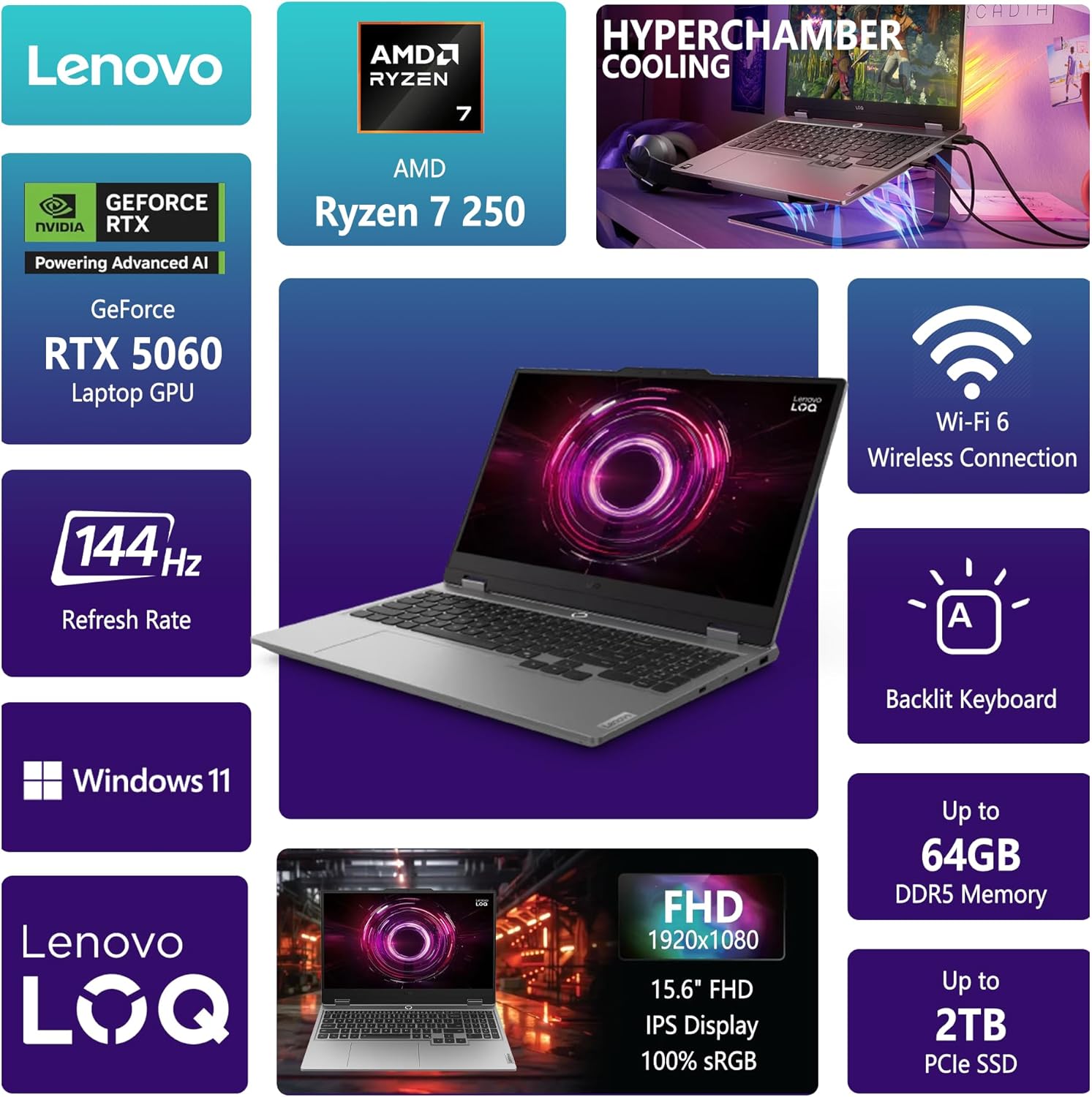 Lenovo LOQ 15 AI-Powered Gaming Laptop | 15.6″ FHD IPS 144Hz (100% sRGB, G-SYNC) | AMD 8-Core Ryzen 7 250 | 32GB DDR5 1TB SSD | GeForce RTX 5060 (572 AI Tops) | Backlit Win11 Pro w/DLCA Accessory
