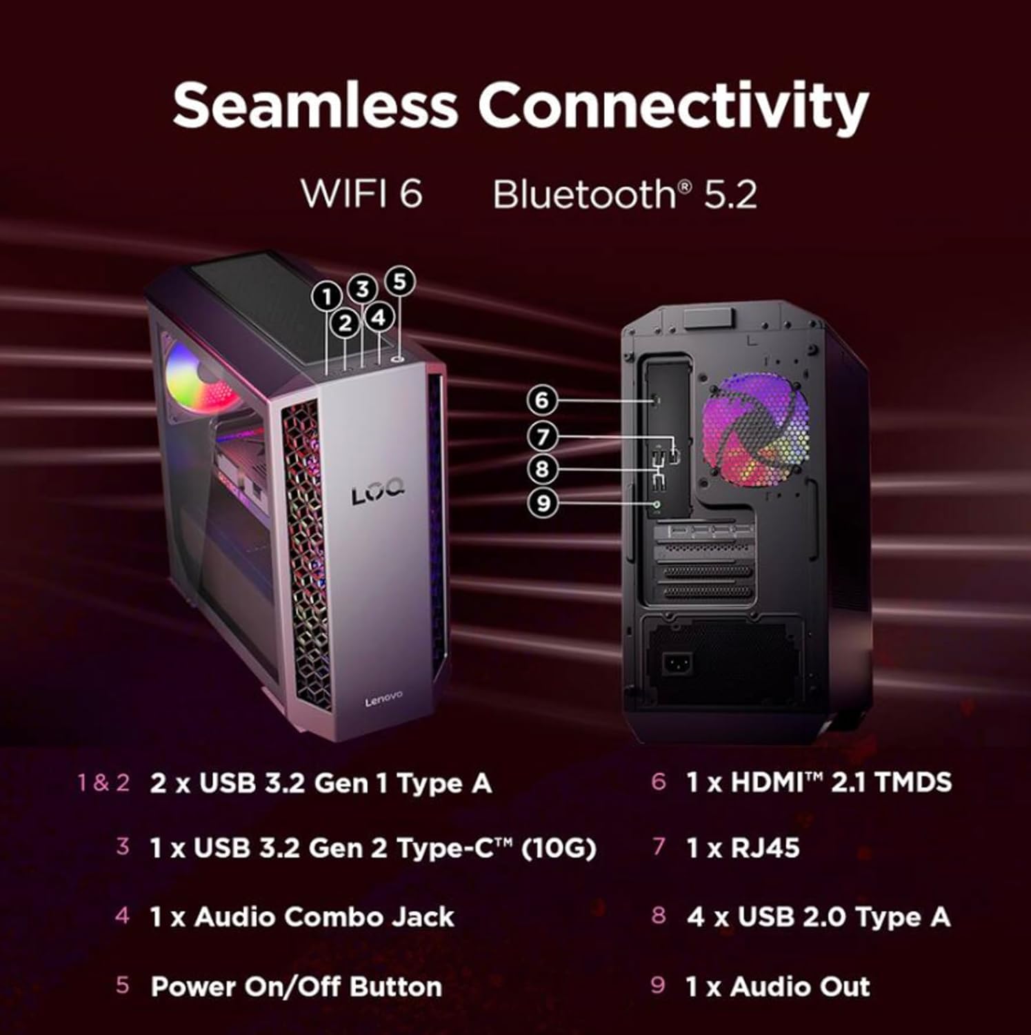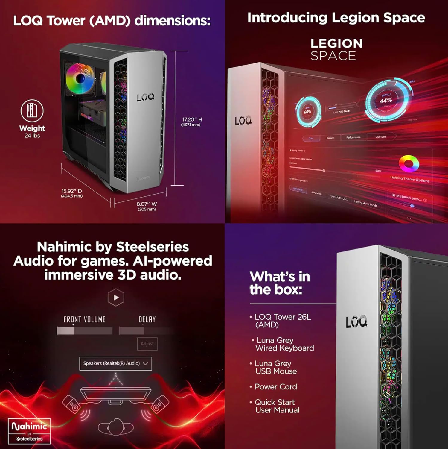 Configuration We offer all of the following configurations, if you cannot find the correct listing please check for other listings on our Store page. Model Name Lenovo LOQ Form/Color Tower/Luna Grey Color RAM Customizable Storage: 16GB, 32GB, 64GB DDR5 SO-DIMM RAM Hard Drive Customizable Storage: 1TB PCIe SSD, 2TB PCIe SSD, 4TB PCIe SSD, 8TB PCIe SSD, 128GB PCIe SSD + 1TB HDD, 128GB PCIe SSD + 2TB HDD, 256GB PCIe SSD + 1TB HDD, 256GB PCIe SSD + 2TB HDD, 512GB PCIe SSD + 1TB HDD, 512GB PCIe SSD + 2TB HDD, 512GB PCIe SSD + 6TB HDD, 1TB PCIe SSD + 2TB HDD, 1TB PCIe SSD (Solid State Drive) + 3TB HDD (Hard Disk Drive) Operating System Window 11 Professional (Win 11 Pro-64), Window 11 Home-64 Processor AMD Ryzen 7 8745HX 3.60GHz Processor (Zen 4 Gen, upto 5.1 GHz, 32MB Cache, 8-Cores, 16-Threads) Graphics Card GeForce RTX 5060 8GB GDDR7 Dual (Integrated+Dedicated) Graphics Connectivity WiFi 6, Bluetooth 5.4, Ethernet (RJ-45) Ports/Slots 4 x USB 2.0 (Type-A), 2 x USB 3.2 (Type-A), 1 x USB 3.2 (Type-C), 2 x HDMI, 3 x Displayport, 1 x Ethernet (RJ-45) and Headphone/Microphone Combo Jack Other Features Grey USB Keyboard, USB Mouse Power Supply 500W Power Supply Product Dimensions (WxLxH) 16.5 IN x 17.25 IN x 8 IN Weight 22.6 lb Includes Authorized Dockztorm Portable USB Hub(Special Edition Portable Dockztorm Data Hub;Super Speedy Data Sync Rate upto 5Gbps)