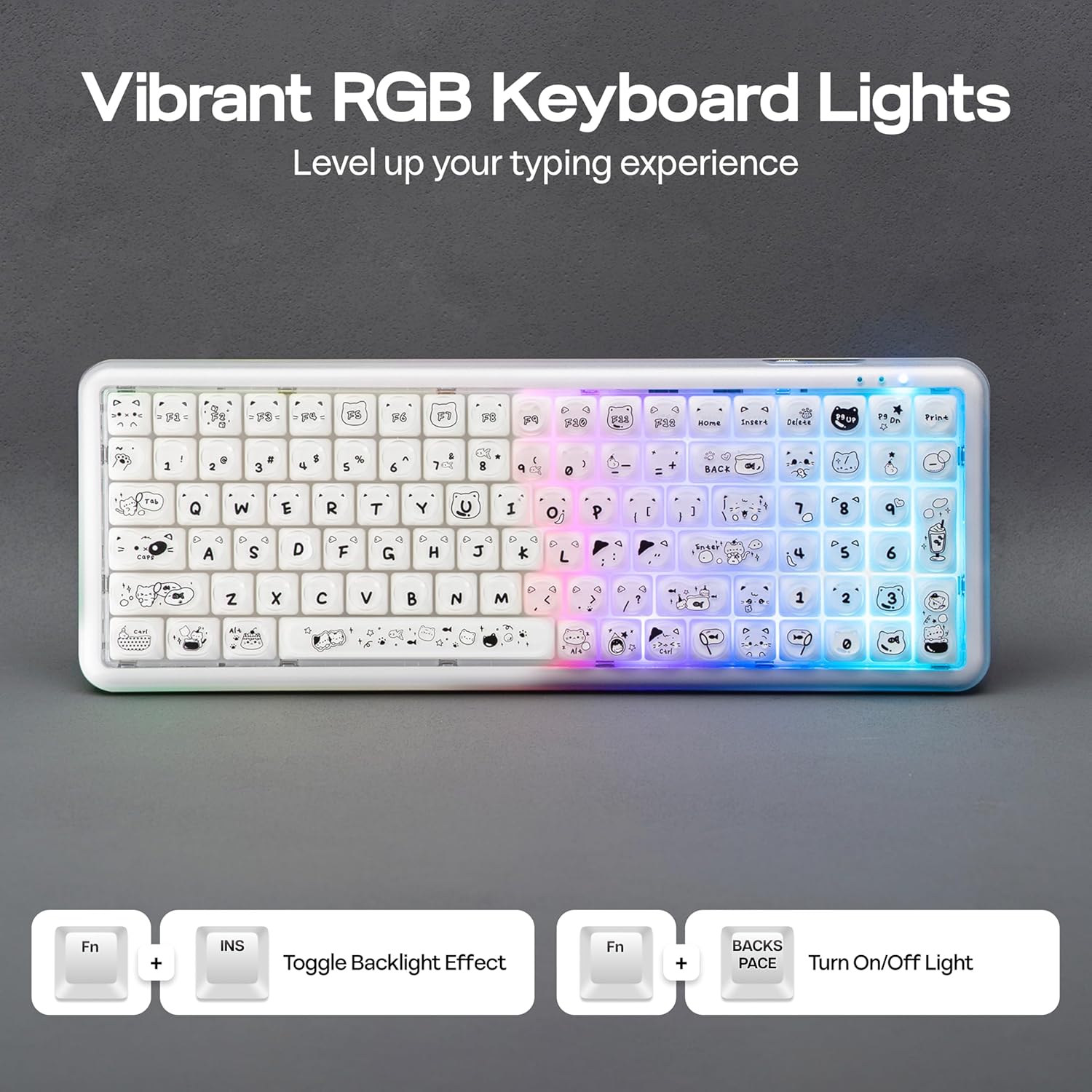 Mechanical-Style Aesthetics, Comfortable Membrane Typing: X100 Pro membrane keyboard replicates the classic floating keycap and narrow-bezel design of mechanical keyboards. Unique liquid foundation keycaps with cute cat patterns add a playful touch to your desktop, satisfying aesthetic needs. Features high-rebound membrane switches that reduce typing noise—ideal for late-night work or dorm use without disturbing others. It also retains a mechanical-like tactile feedback, making typing rhythmic yet noise-free.