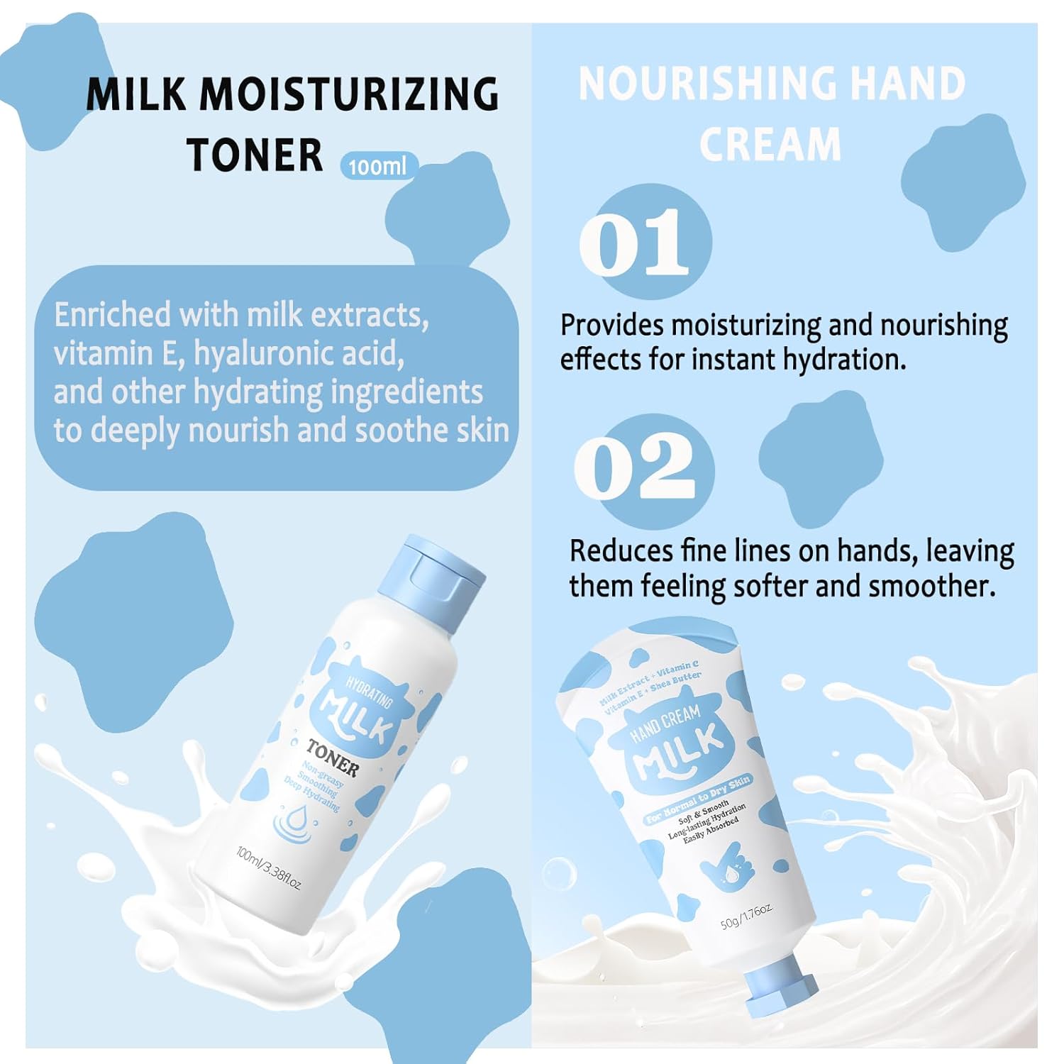 【Powerful and Long-Lasting Hydration】 Enriched with moisturizing ingredients such as milk extract, vitamin E, and hyaluronic acid, our milk skin care deeply hydrates and soothes. The lightweight formula is easily absorbed and won’t clog pores. It improves skin elasticity.