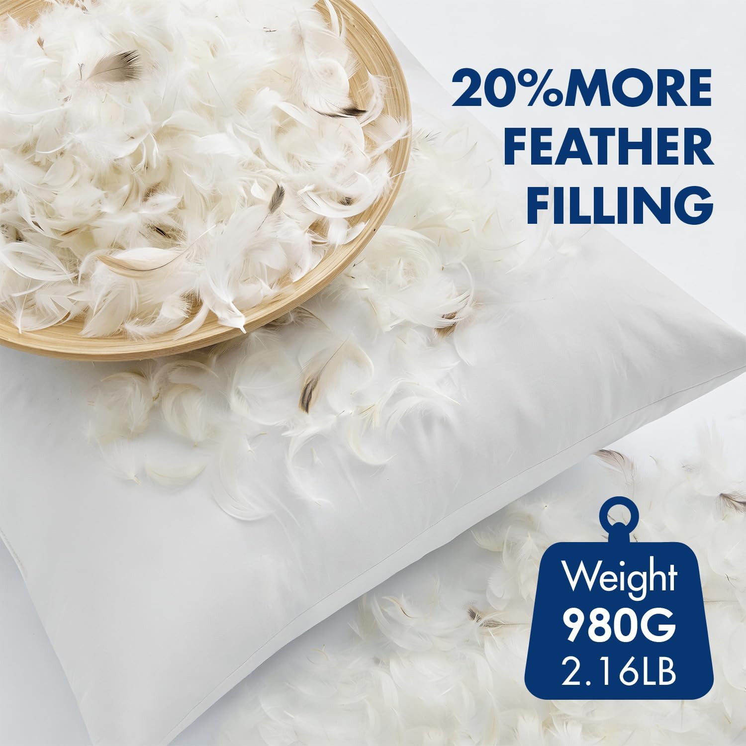Premium Material: These pillow inserts are filled by 980 g/2.16 lb premium feather and down(20% more than other). The upgraded dual-layer cover combines a tightly woven 100% cotton down-proof outer layer with a thick inner layer to prevent feather from poking out while enhancing overall comfort. Durable, smooth, and cozy, it keeps your pillows looking clean and well-shaped.