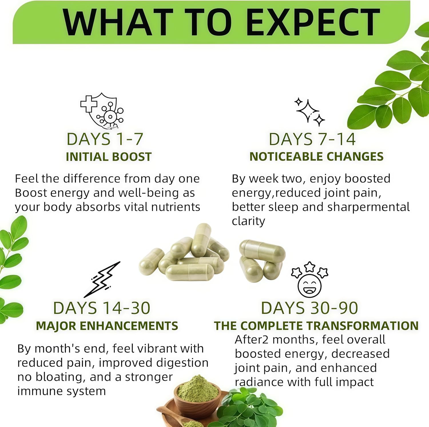 【Easy Swallow Capsules】:All of our dietary supplements contain high potency extracts that are free of additives and GMOs, convenient easy to swallow capsules packed with the benefits of moringa powder. Take 2 Moringa capsules per day, one bottle of 90 capsules lasts 45 days.